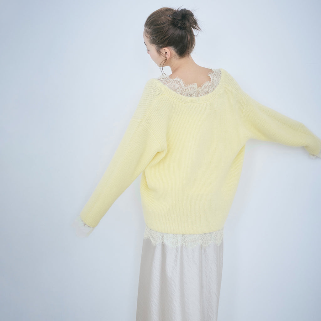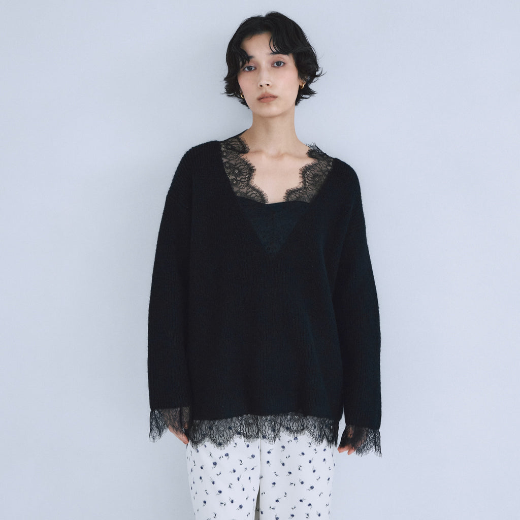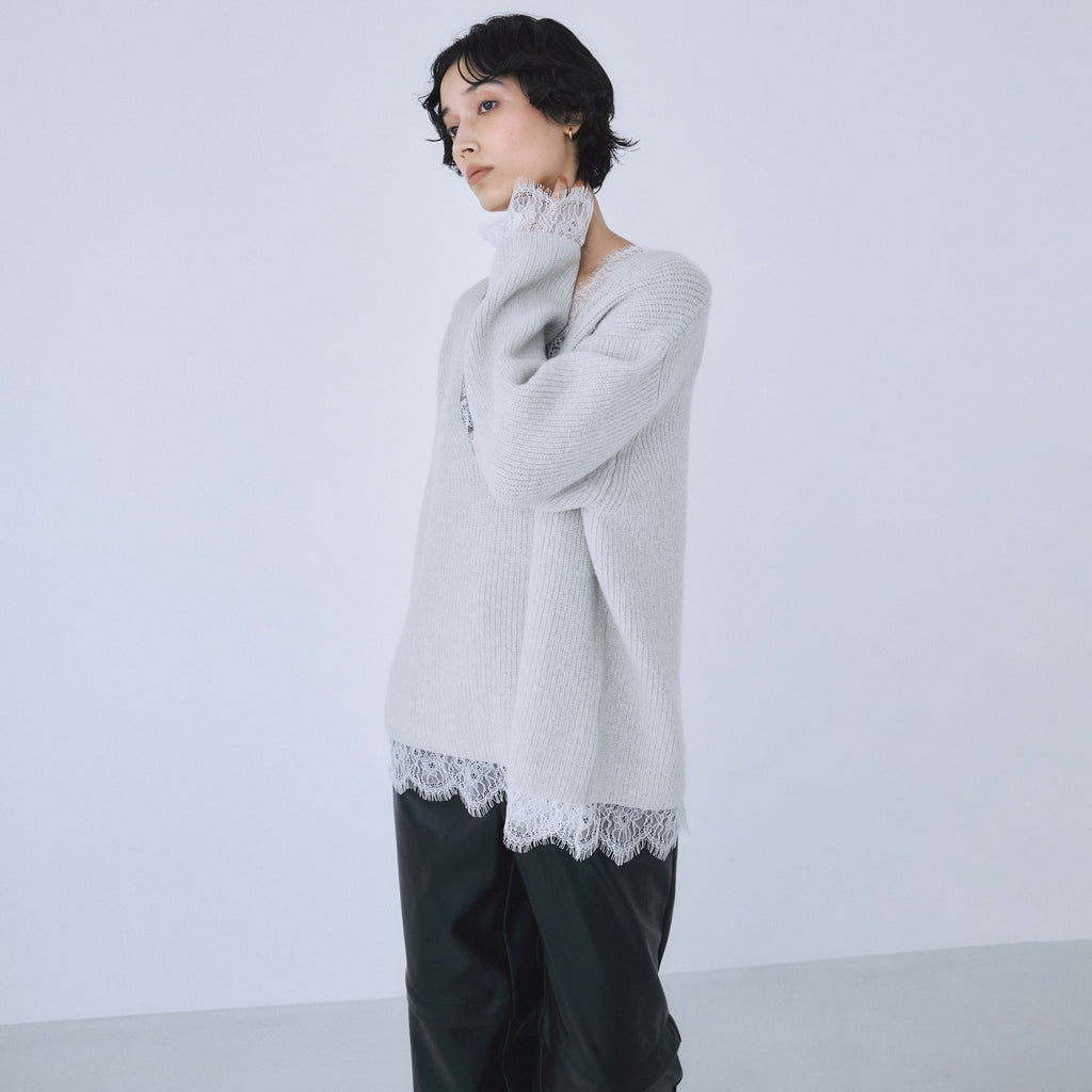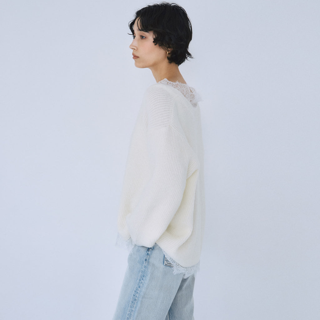 モヘヤ混のふんわり素材に、アイラッシュレースを贅沢にあしらった、上品で軽やかなニットトップス。ヒップが隠れる着丈で、レイヤードもしやすく、着回し力抜群です。