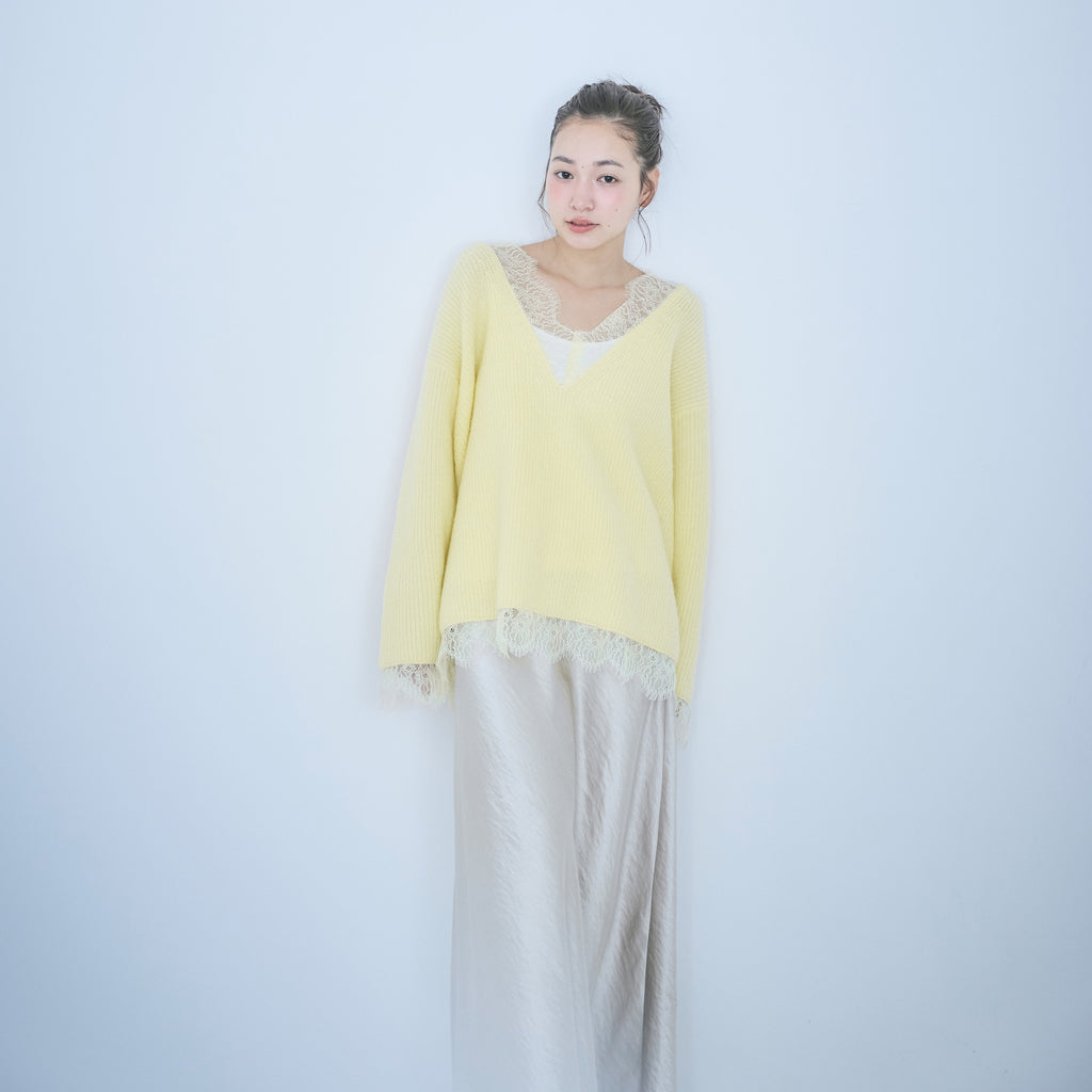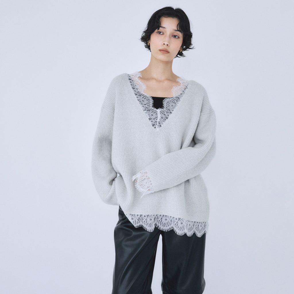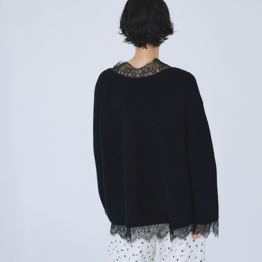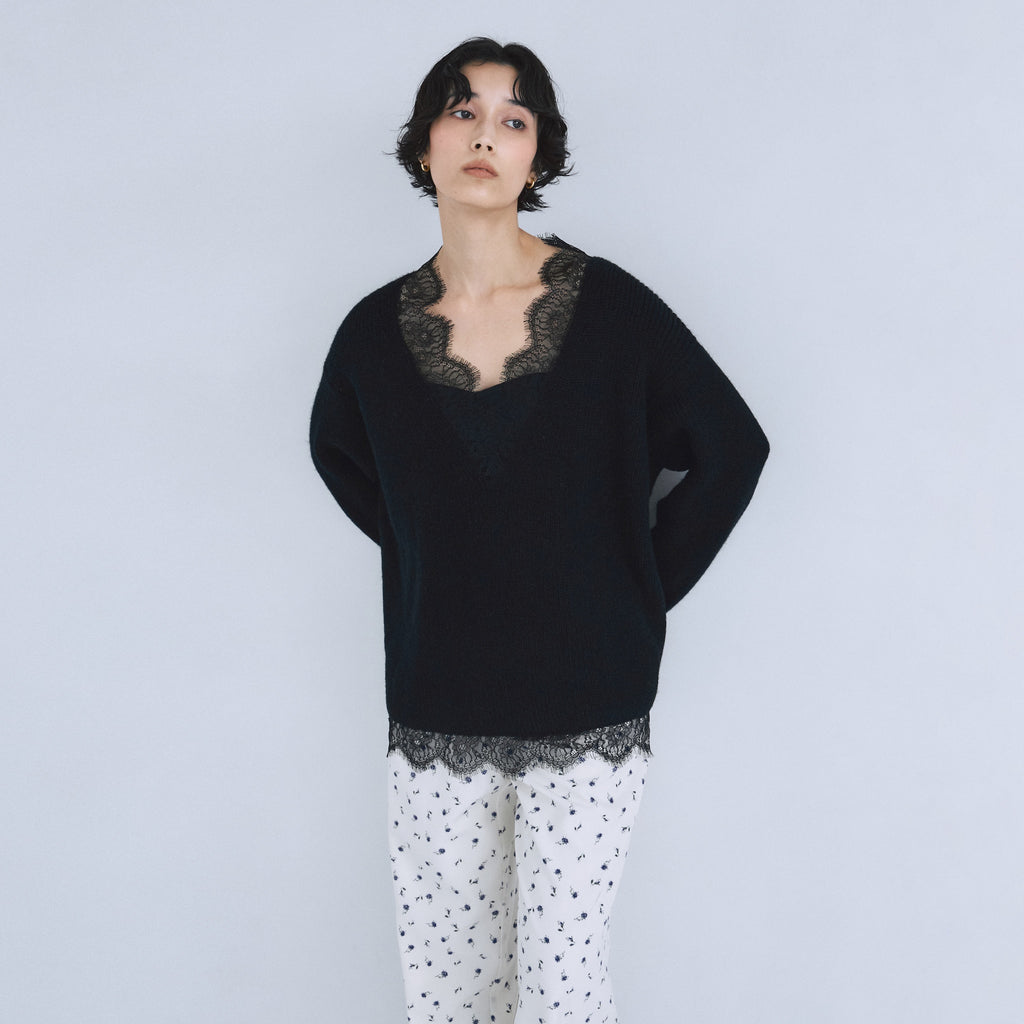 モヘヤ混のふんわり素材に、アイラッシュレースを贅沢にあしらった、上品で軽やかなニットトップス。ヒップが隠れる着丈で、レイヤードもしやすく、着回し力抜群です。
