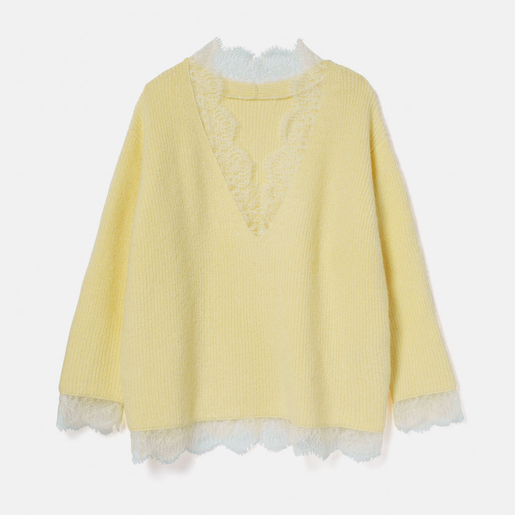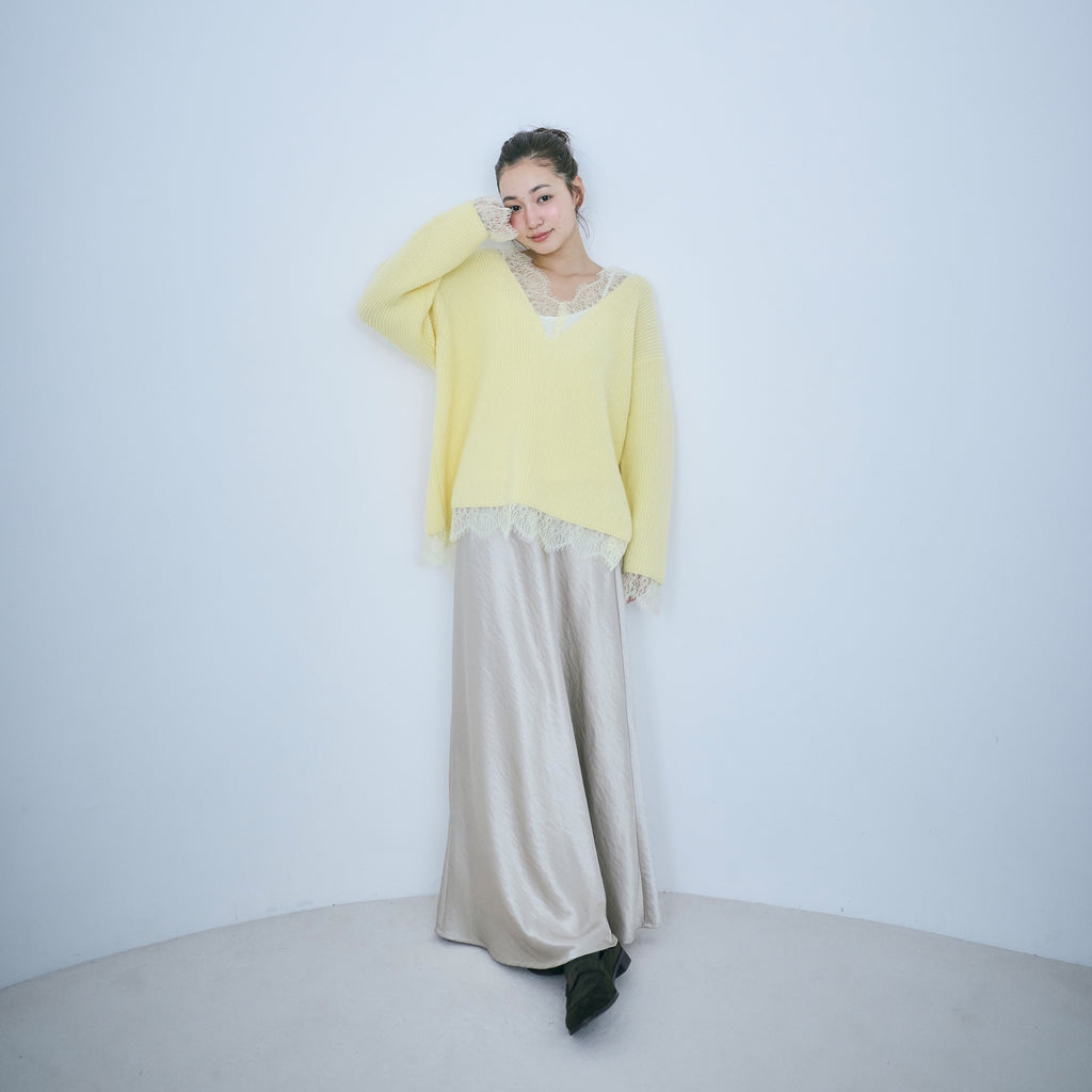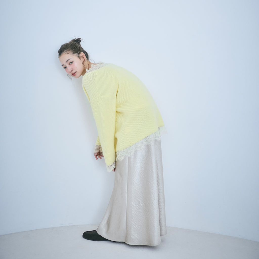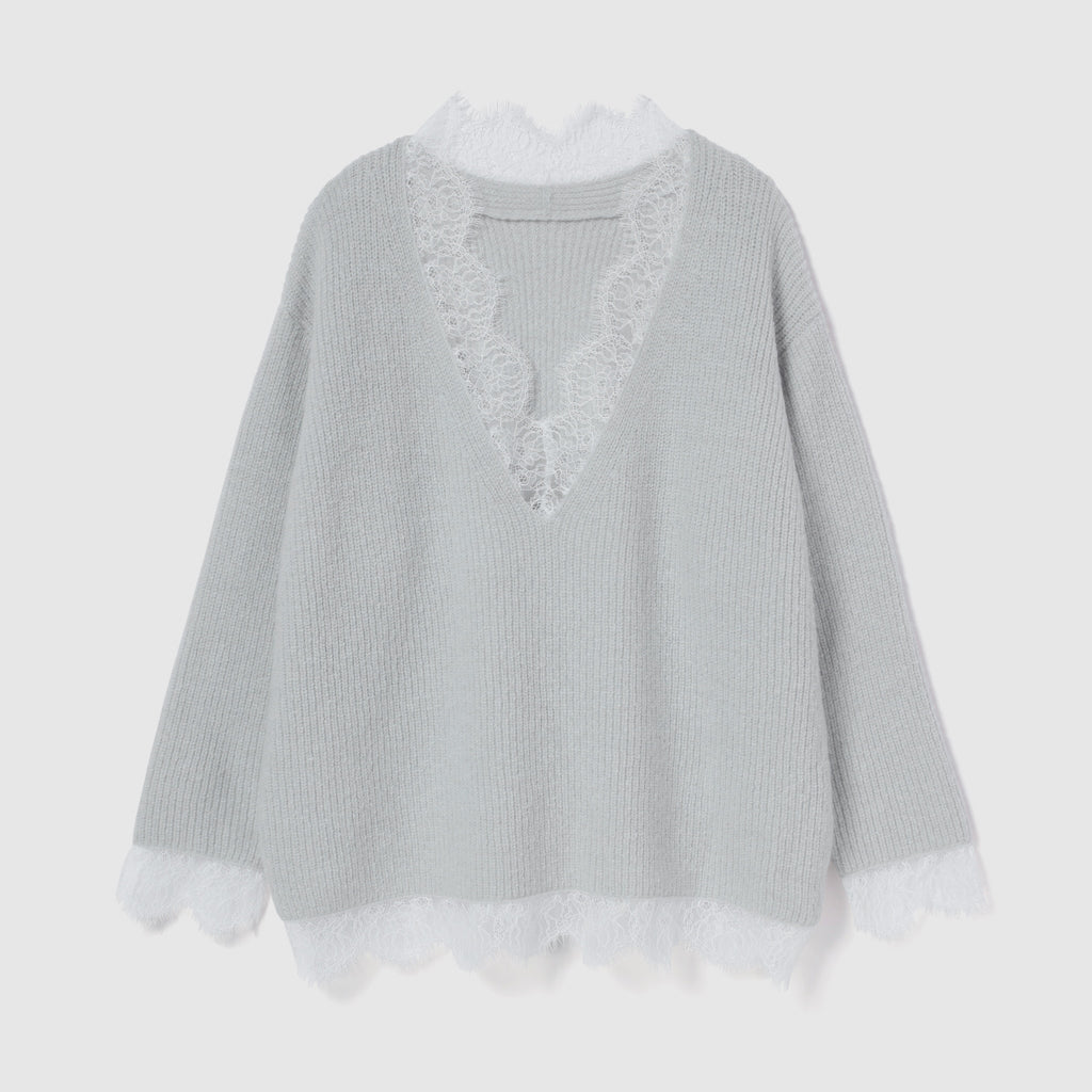 モヘヤ混のふんわり素材に、アイラッシュレースを贅沢にあしらった、上品で軽やかなニットトップス。ヒップが隠れる着丈で、レイヤードもしやすく、着回し力抜群です。