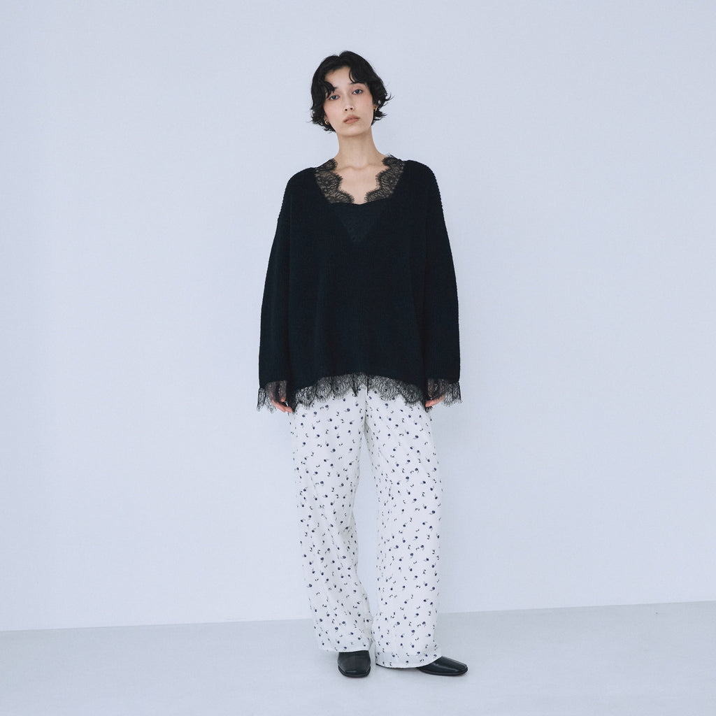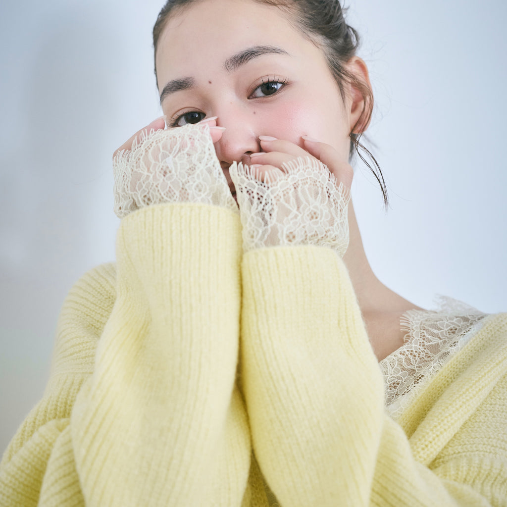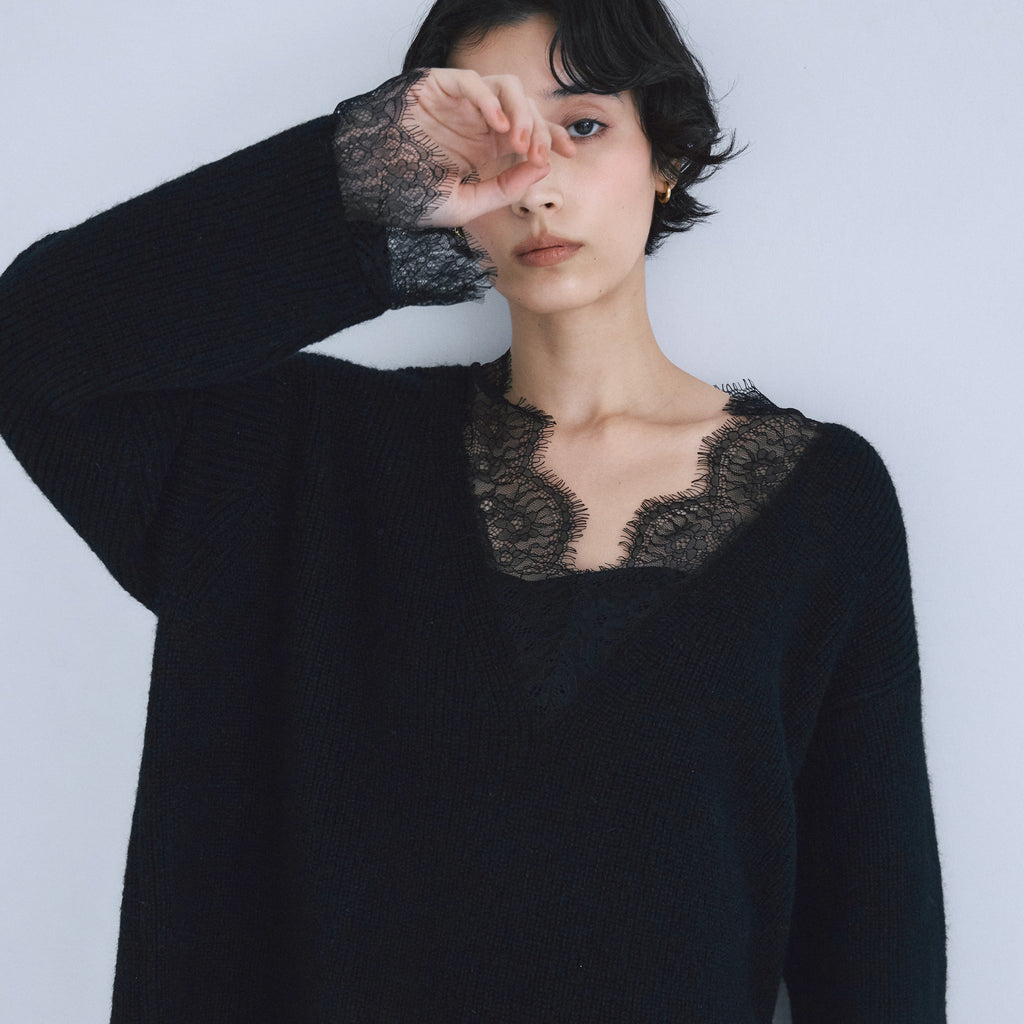 深めのVネックにアイラッシュレースを贅沢にあしらい、レディな印象に。山谷がしっかりとあるスカラップレースなので、レースの華やかさがより引き立ちます。袖口と裾にも同じレースを施しているため、1枚でスタイリングが完成する存在感のあるアイテムです。