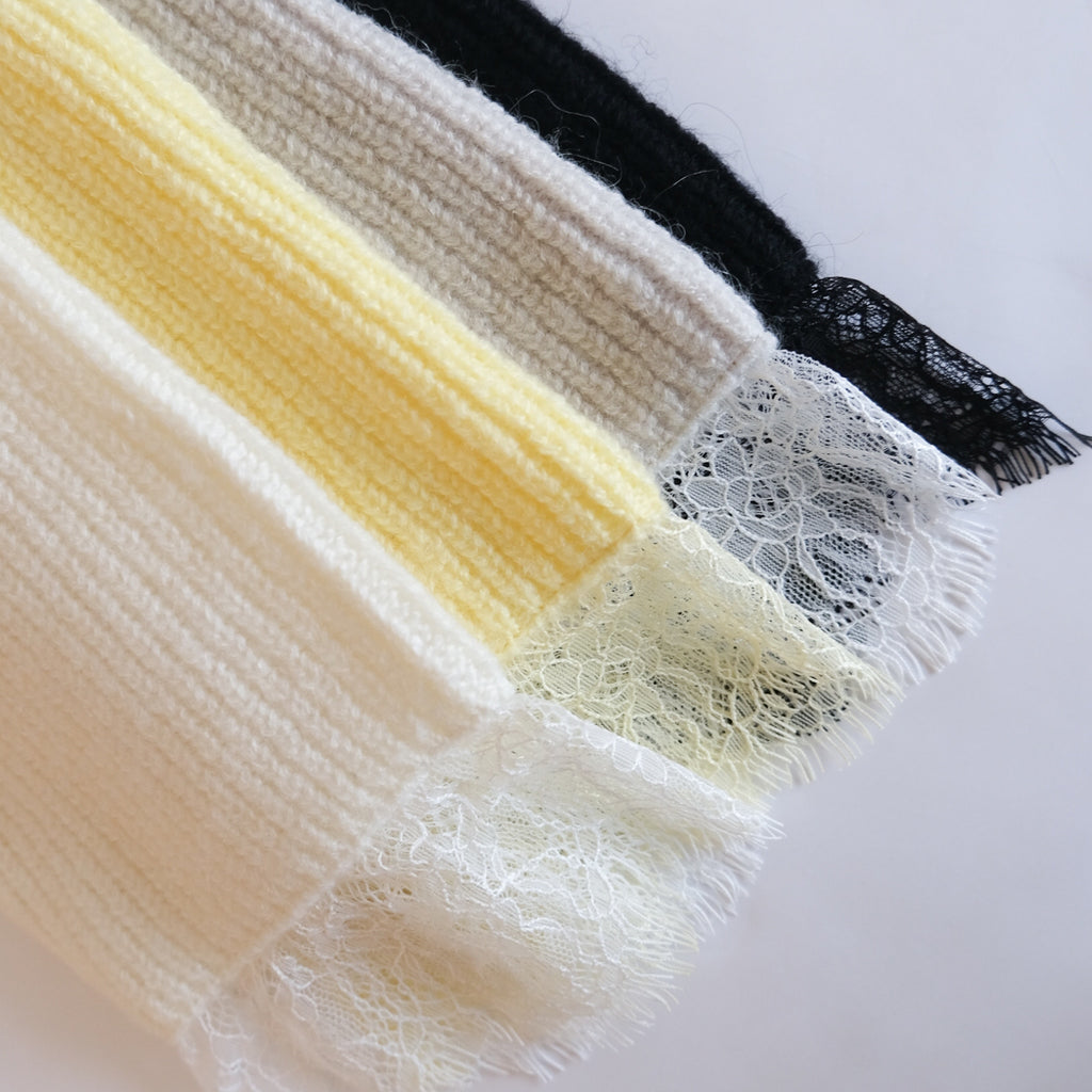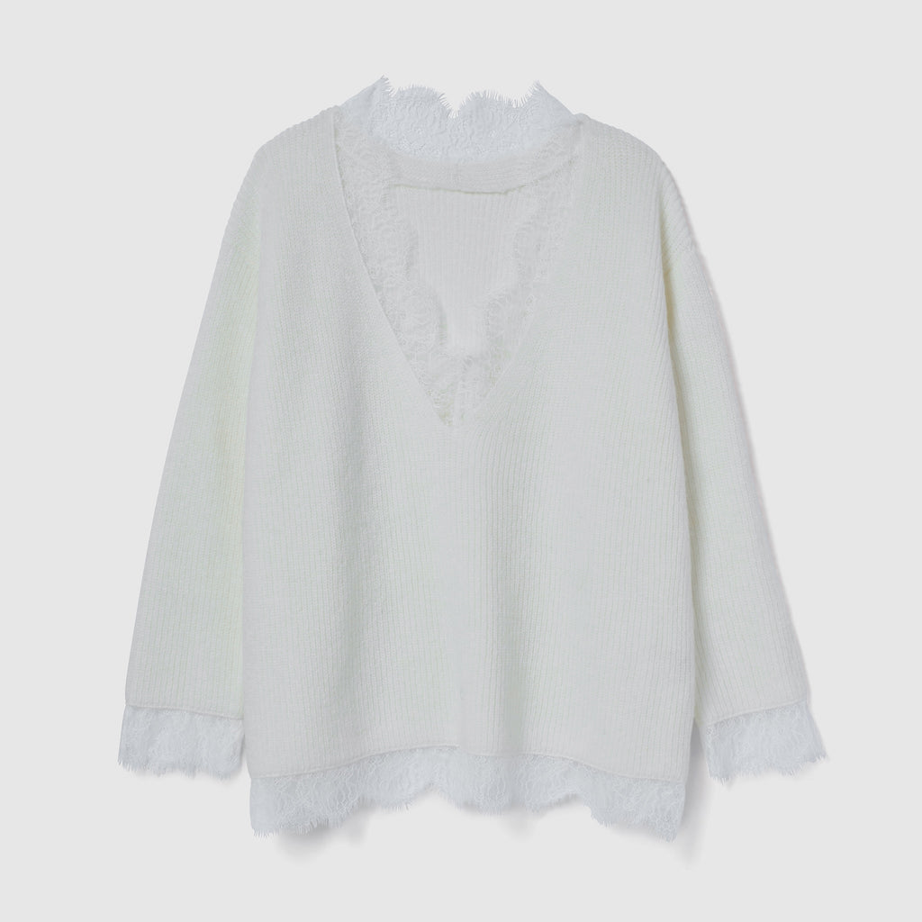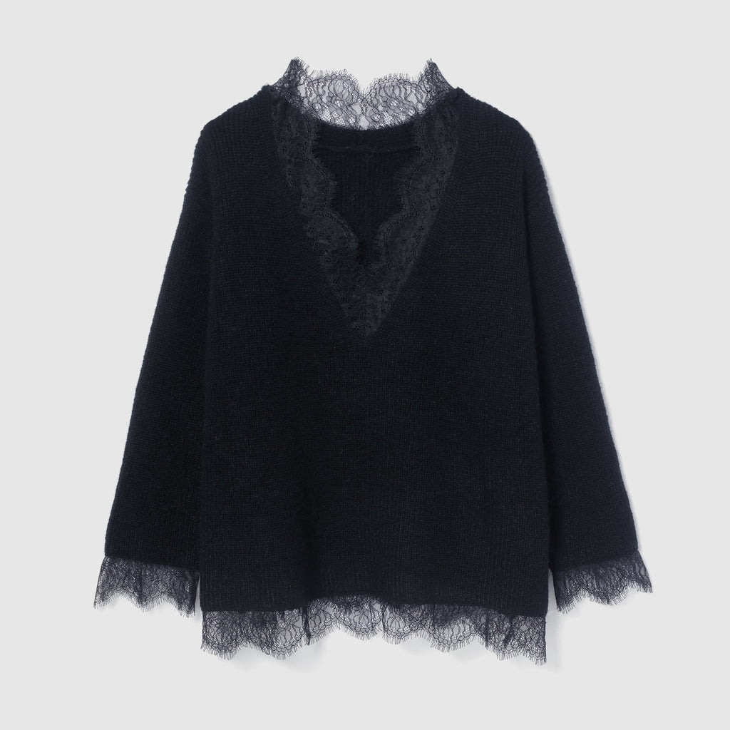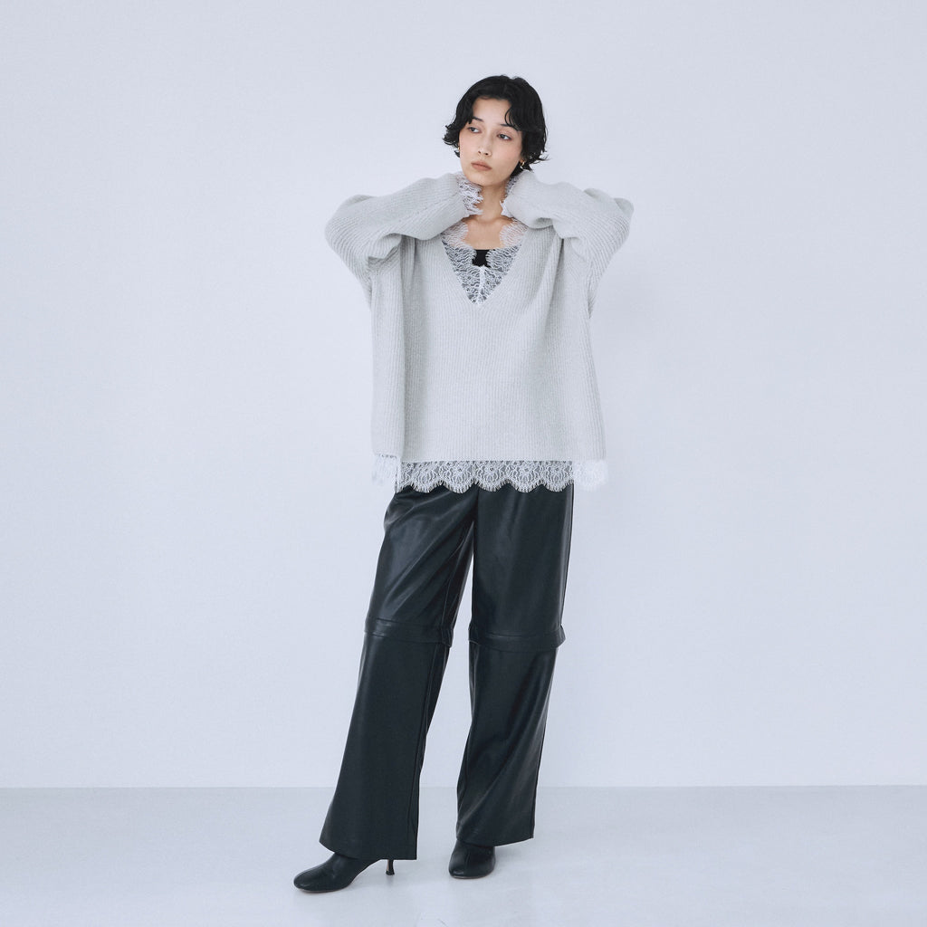 深めのVネックにアイラッシュレースを贅沢にあしらい、レディな印象に。山谷がしっかりとあるスカラップレースなので、レースの華やかさがより引き立ちます。袖口と裾にも同じレースを施しているため、1枚でスタイリングが完成する存在感のあるアイテムです。