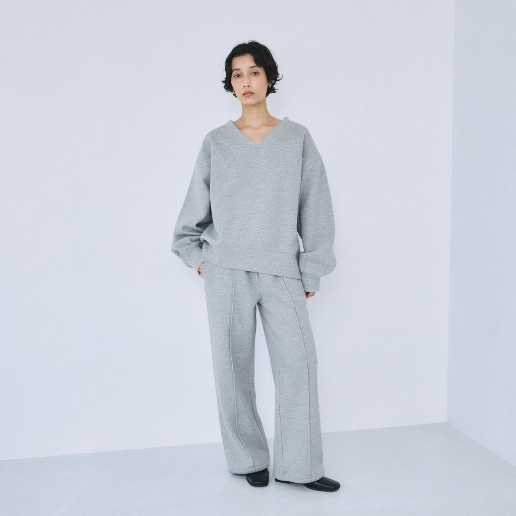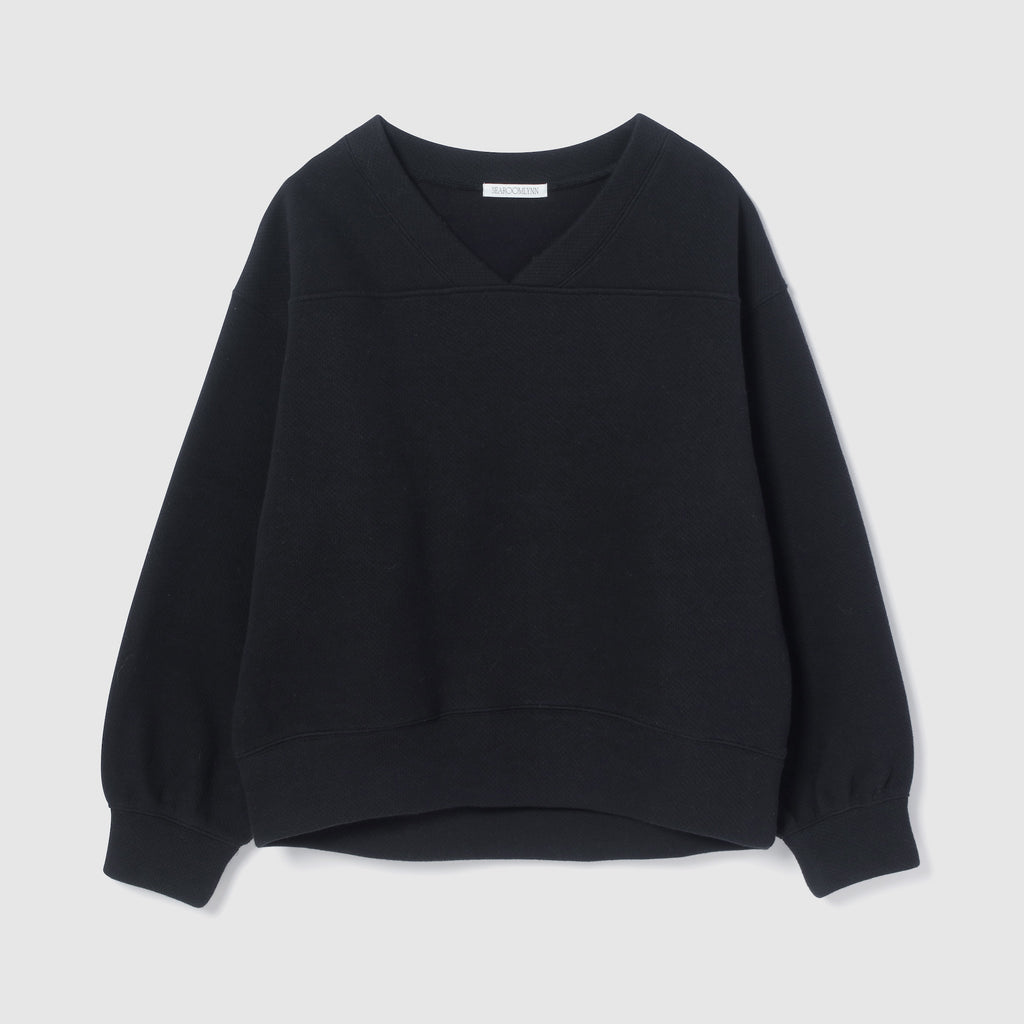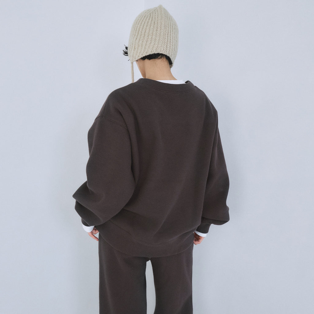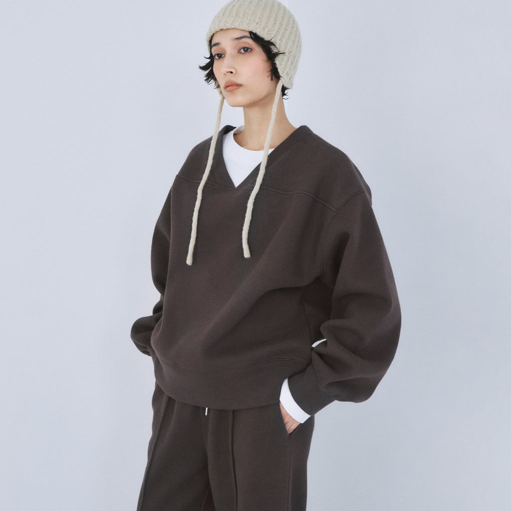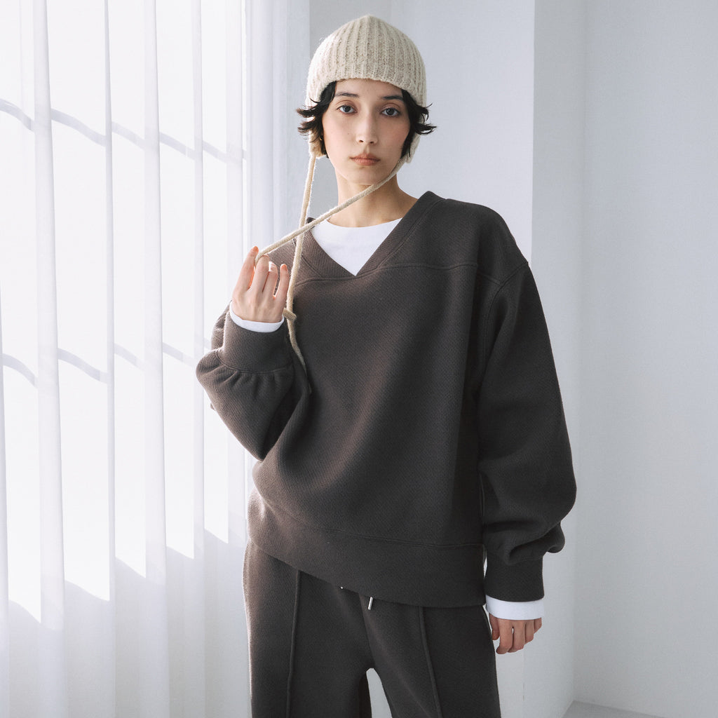 スポーティなデザインながら、開きすぎないVネックにすることで大人っぽいバランスに。裾口&袖口は、凹凸が出るよう幅や縫製に工夫を施し、シンプルな中に立体感のある表情を作り出しています。