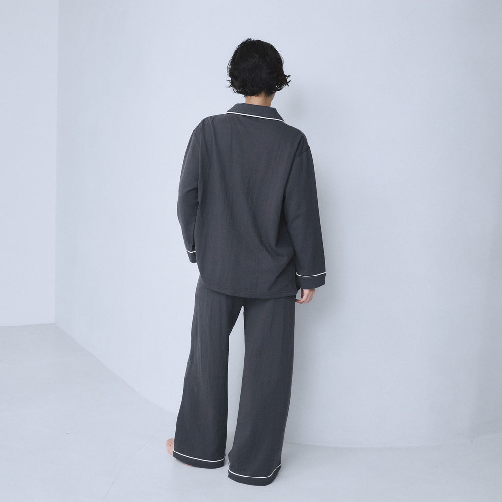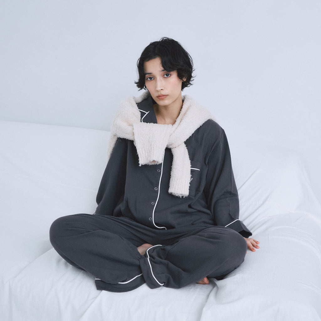 HOMEシリーズから待望の、長袖タイプのルームウェアが登場。リラックス感のあるシルエットながらも、ラフすぎない上品さをディテールで魅せるセットアップです。トップはワンサイズ、パンツはS /Mの2サイズ展開。