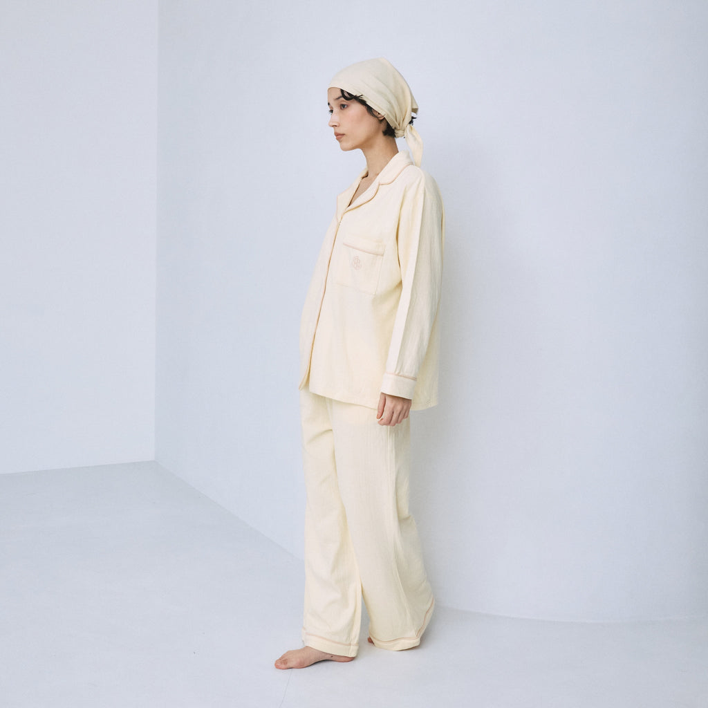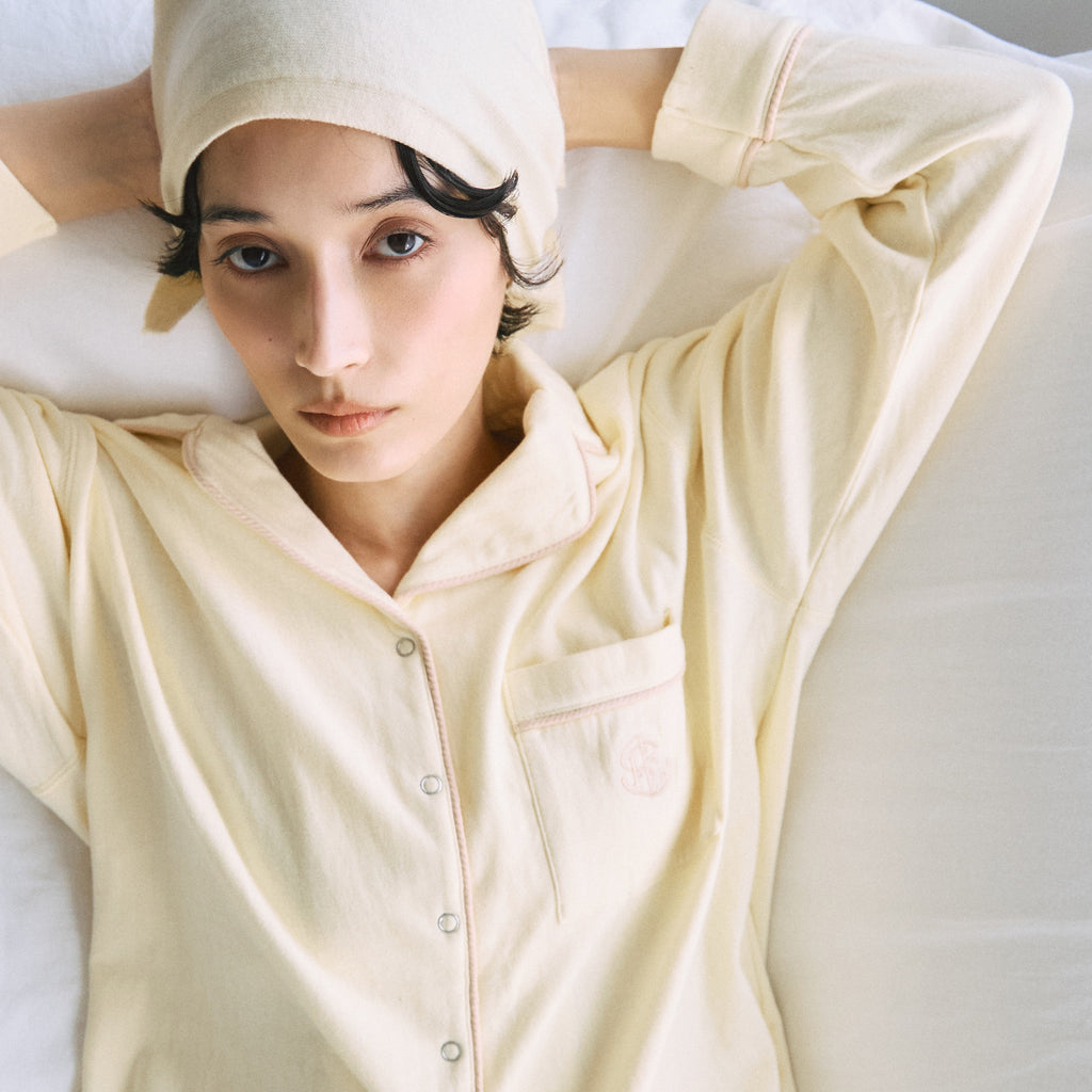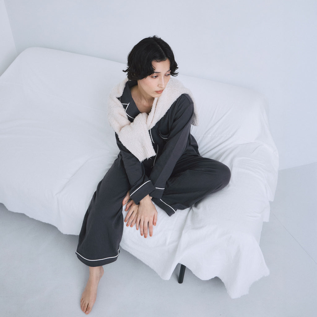 着心地の良さに定評のある〈C/2 ACE〉シリーズの生地を使用しています。裏面がガーゼ調になった2枚仕立ての素材は、吸湿性・速乾性・通気性に優れており、睡眠時の蒸れを防いで快適さをキープ。肌当たりも柔らかく、ナイトウェアとしてはもちろん、日中のおうち時間にも心地良く寄り添ってくれる素材です。