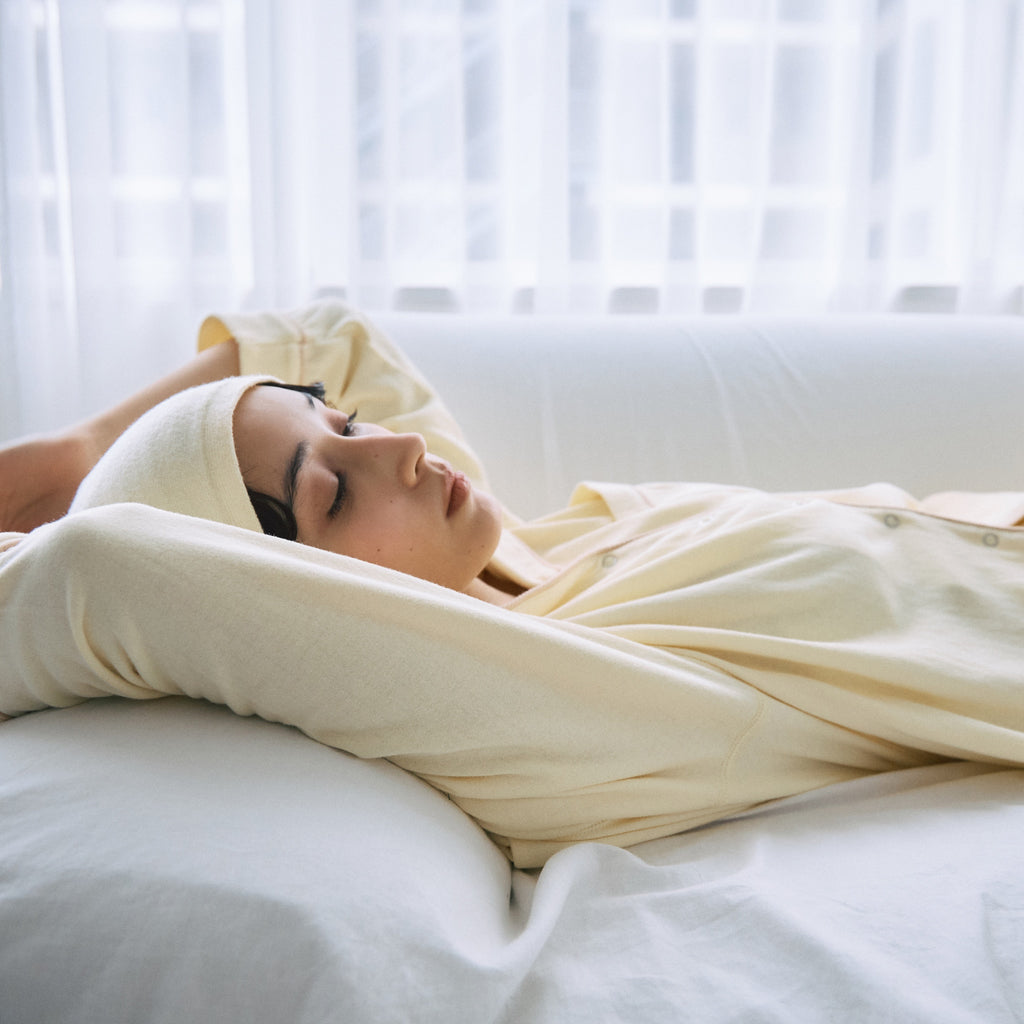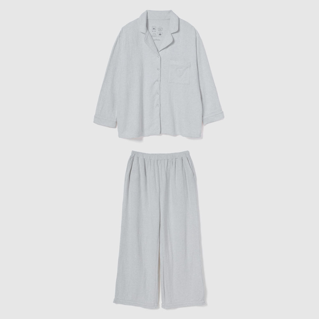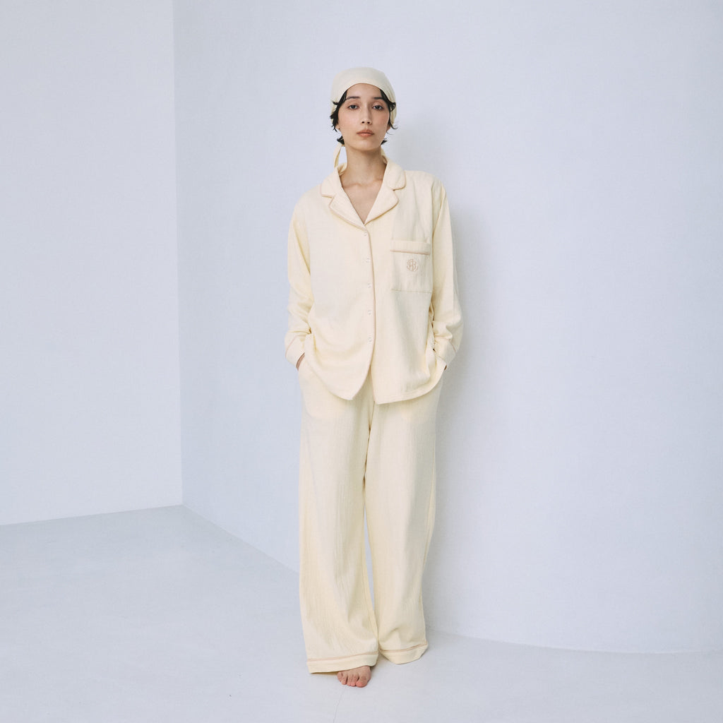 着心地の良さに定評のある〈C/2 ACE〉シリーズの生地を使用しています。裏面がガーゼ調になった2枚仕立ての素材は、吸湿性・速乾性・通気性に優れており、睡眠時の蒸れを防いで快適さをキープ。肌当たりも柔らかく、ナイトウェアとしてはもちろん、日中のおうち時間にも心地良く寄り添ってくれる素材です。