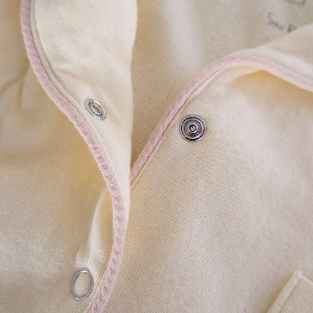 優しい印象を与える丸みのある襟が特徴。各所に配色バインダーを施し、さりげないアクセントをプラスしています。また、胸元にも碇マークのSRLロゴがワンポイントで入っています。フロントはスナップボタン仕様で、着脱しやすくストレスなく扱えるデザインです。