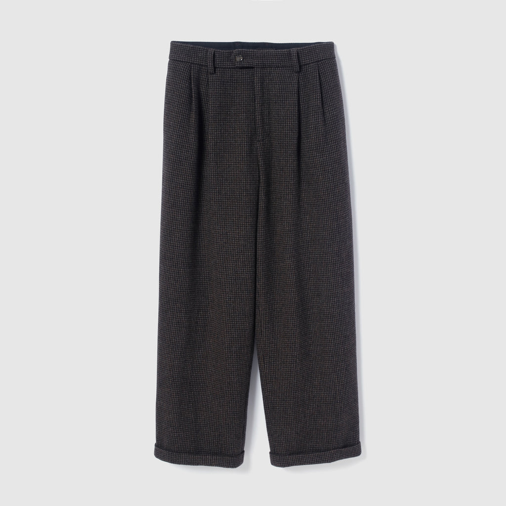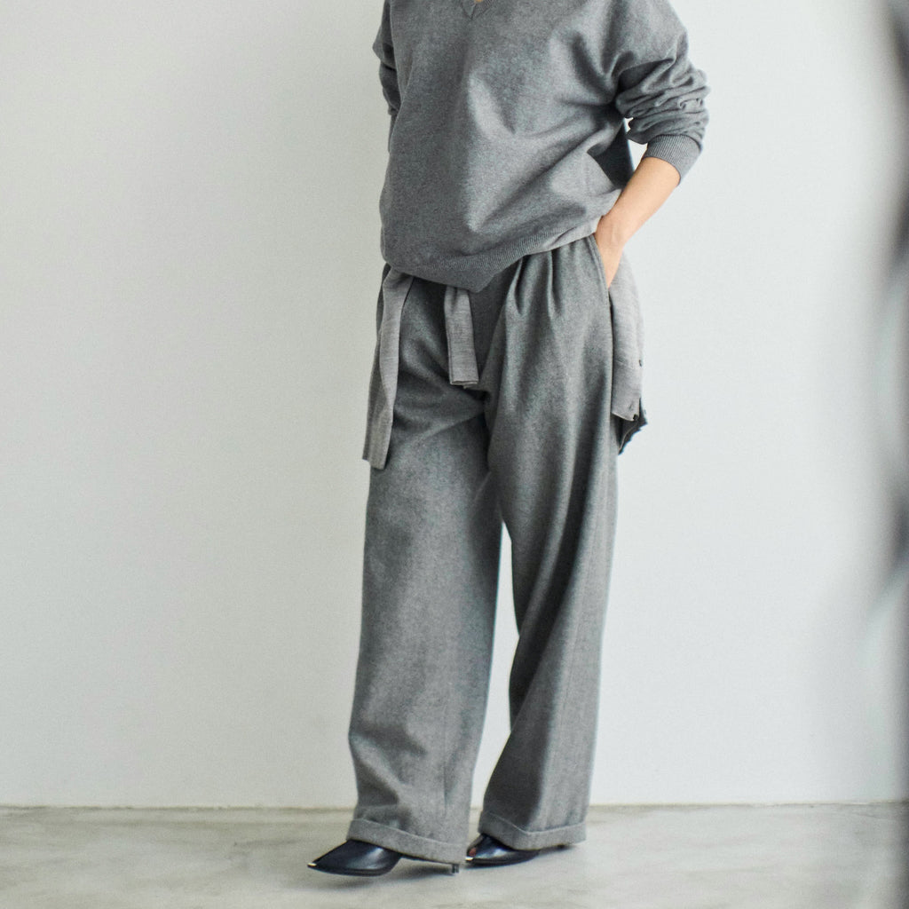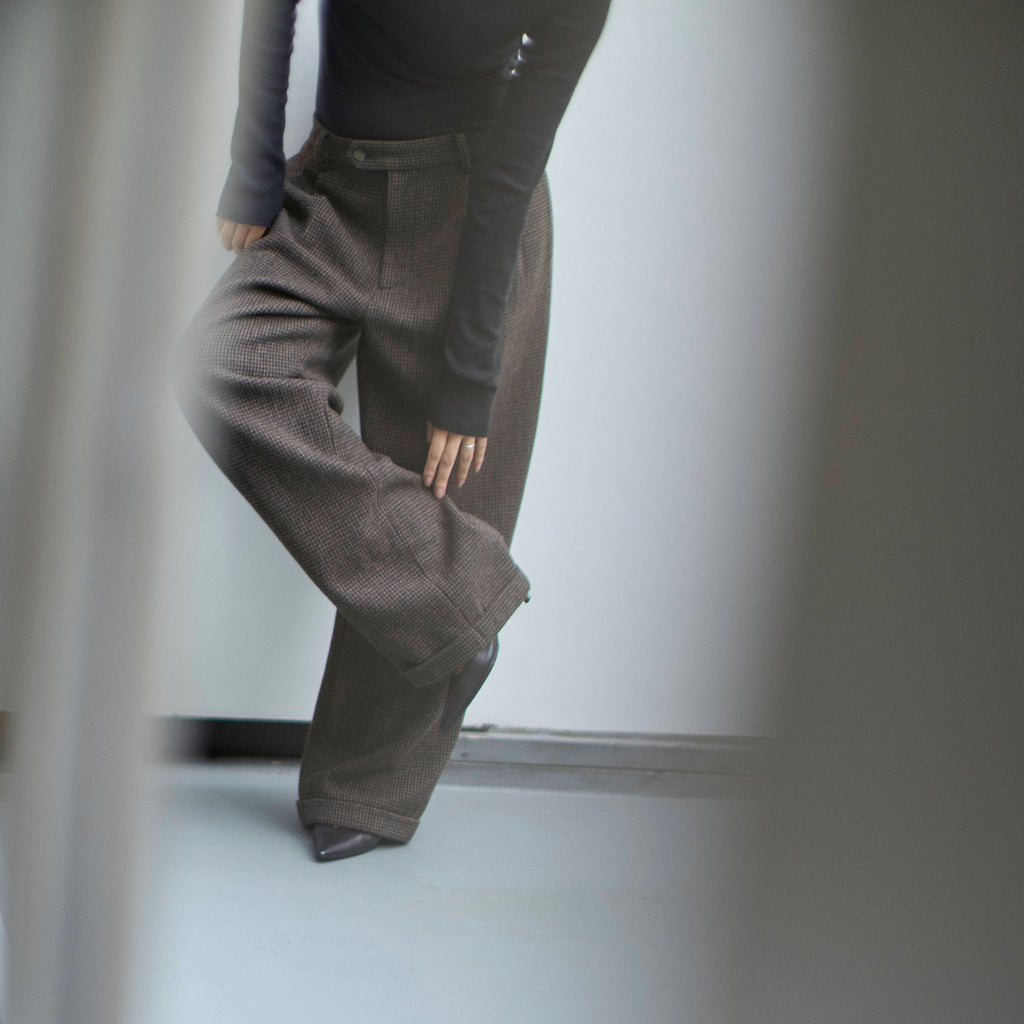 ジャケットなどに用いられる上質なフラノ生地を採用。表面にほのかな起毛があり、温かみと季節感のあるのがフラノの特徴です。型崩れしにくく、かっちりとした高級感もポイントに。
