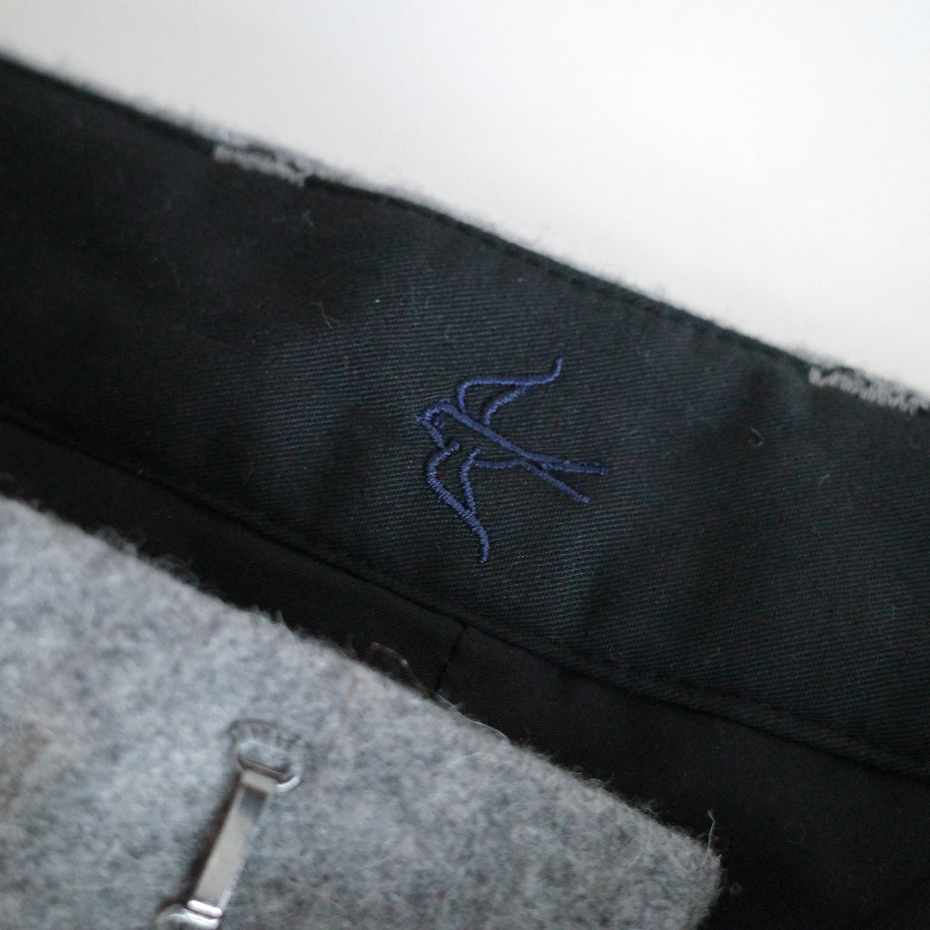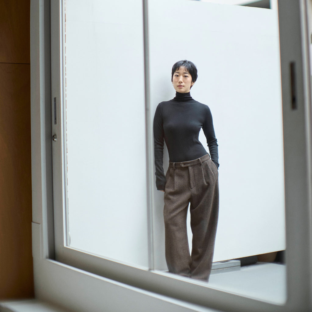 幸運 のつばめモチーフを添えた 腰穿きワイドスラックス。トレンドのゆったりウエストで抜け感を演出しながら、フロントタックでキレイめな印象もプラスしています。