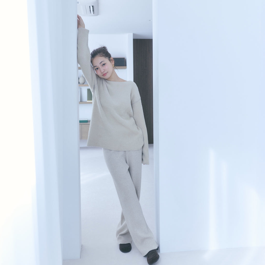 極上タッチと軽さを両立するシャギーニットで仕立てたストレートパンツ。ニット素材特有の重さを抑えたすっきりラインが魅力。セットアップから単品使いまで幅広く活躍します。