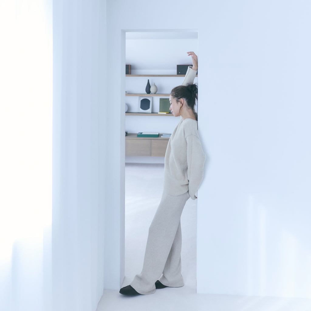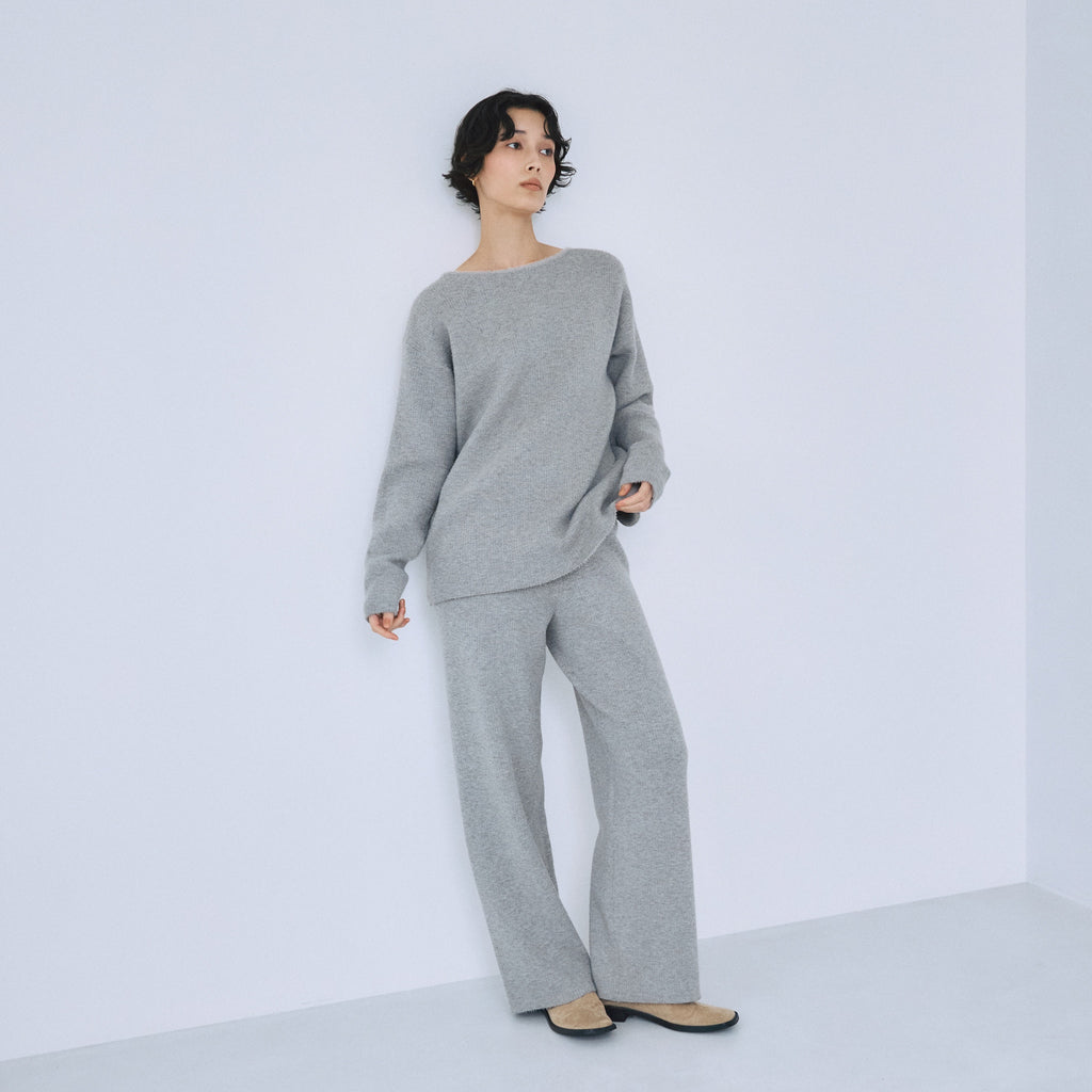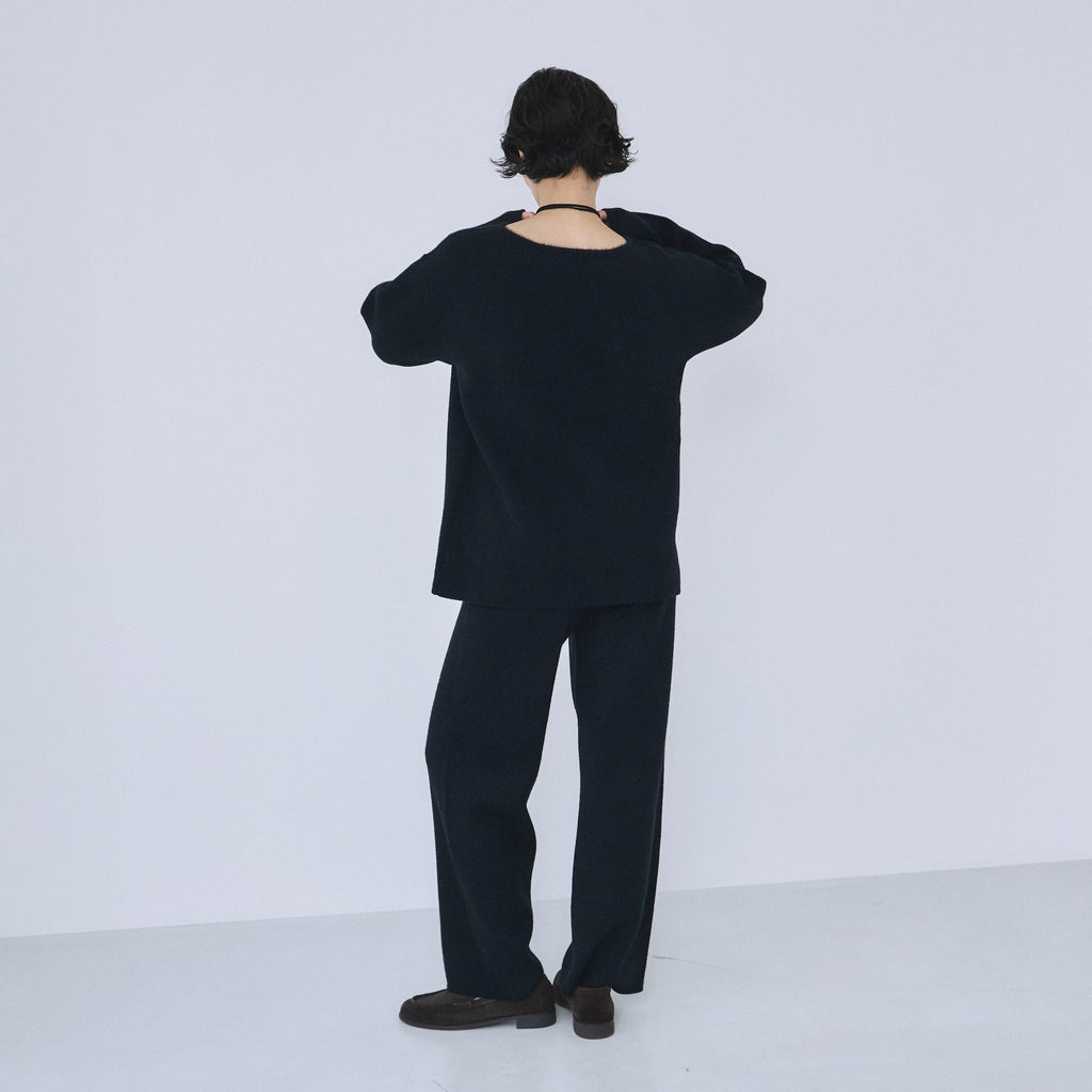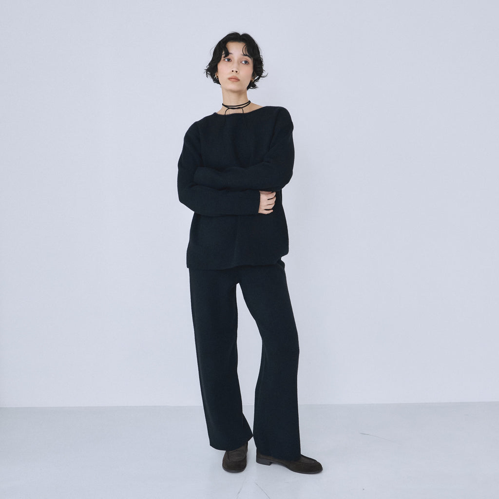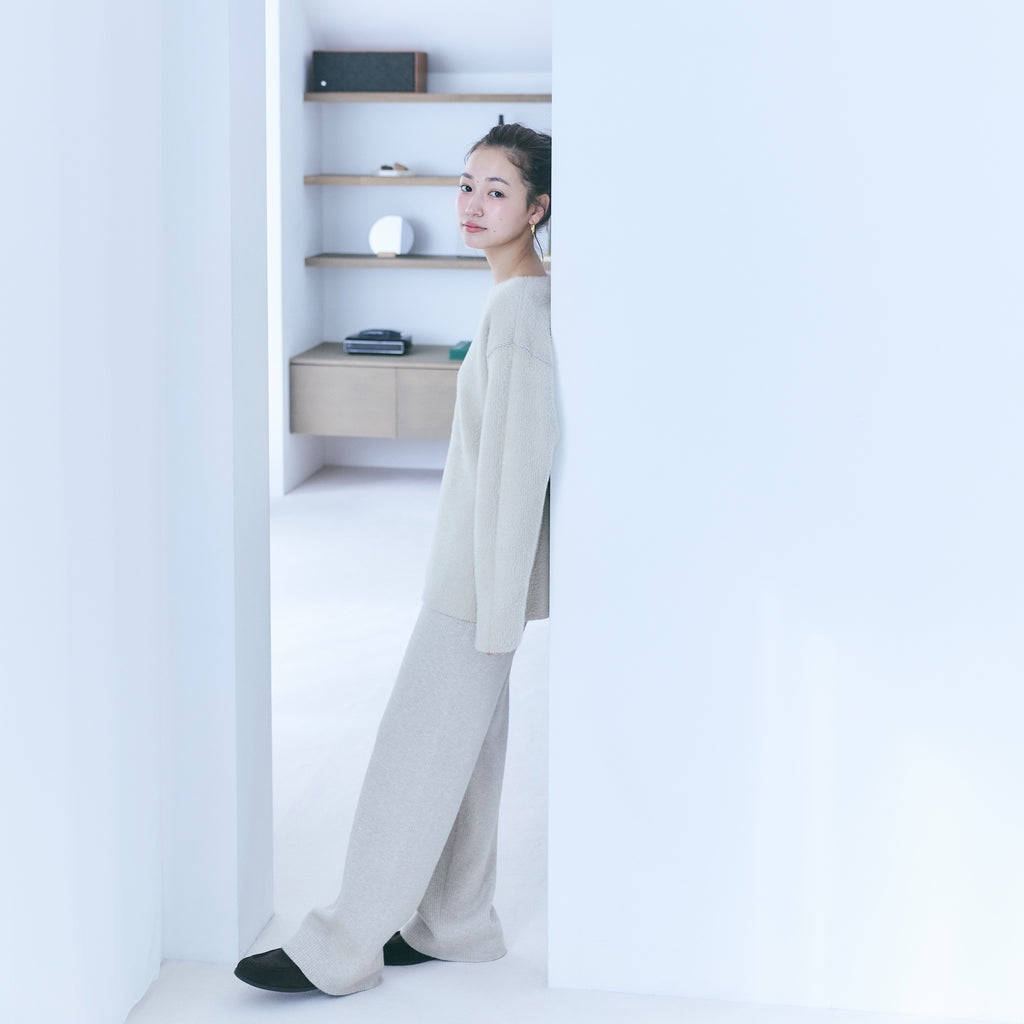 ヒップから裾までなだらかに落ちるストレートシルエット。股下をやや短めに設計することで、ニットの重さが目立たず軽やかに見えるバランスを実現しています。ストンと落ちるラインが脚を綺麗に見せ、リラックス感と洗練感を両立します。