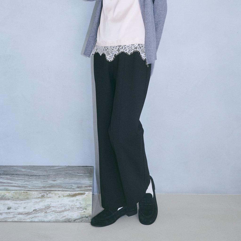 飽きのこないシンプルなデザインで、レイヤードにも使いやすい1枚。フロント中央の切り替えステッチが、脚をまっすぐ美しく見せてくれます。ウエストは一周ゴム仕様で、綺麗見えしながらも楽ちん&レギンス感覚で着られるのも魅力。