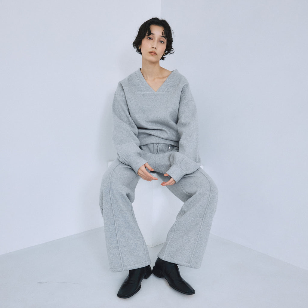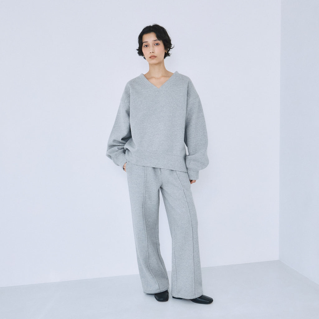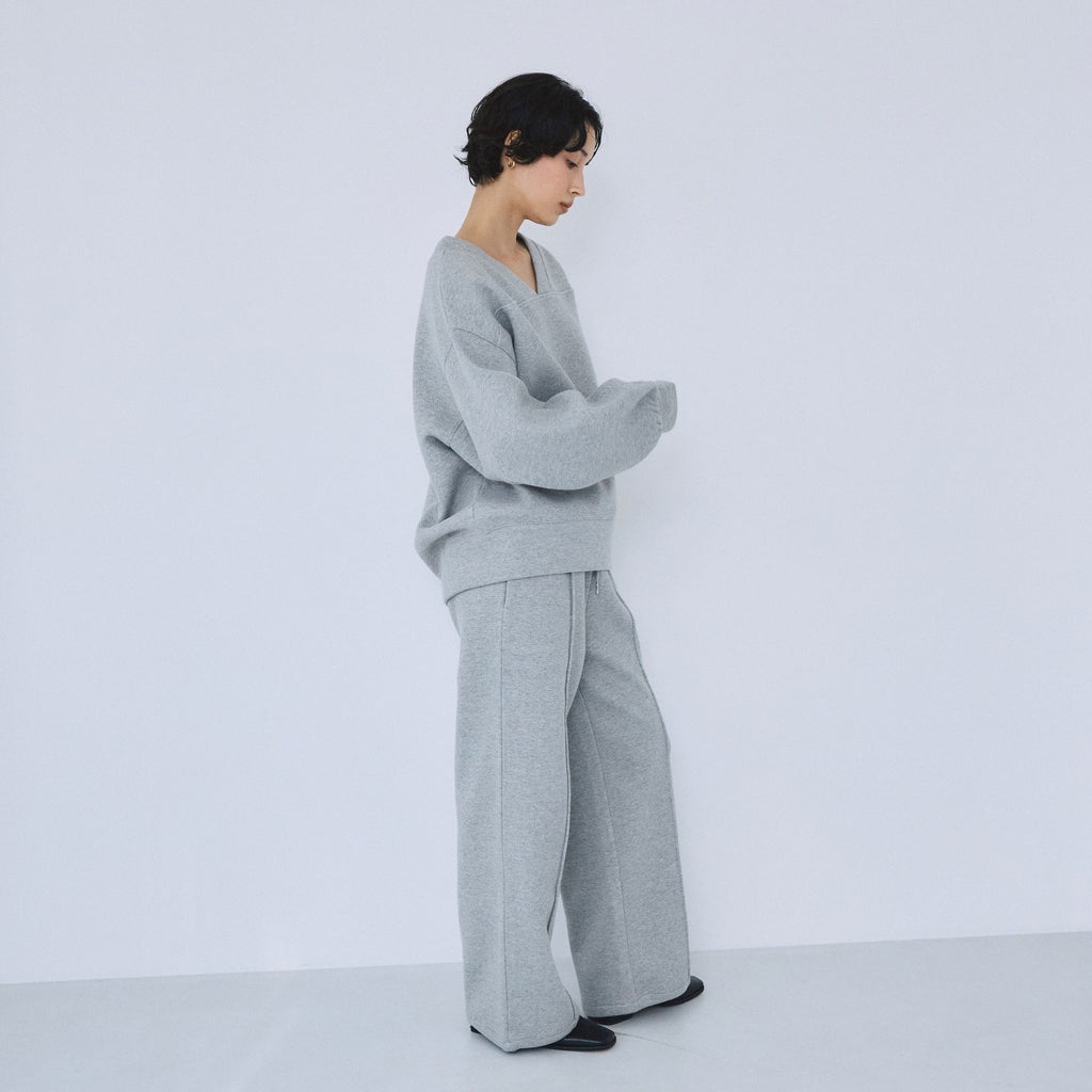 〈VネックメッシュSweatプルオーバー〉とのバランスを考え、パンツもややワイドめに設計したストレートシルエット。素材にハリがあるため、着膨れしないよう全体のバランスを細かく調整しています。