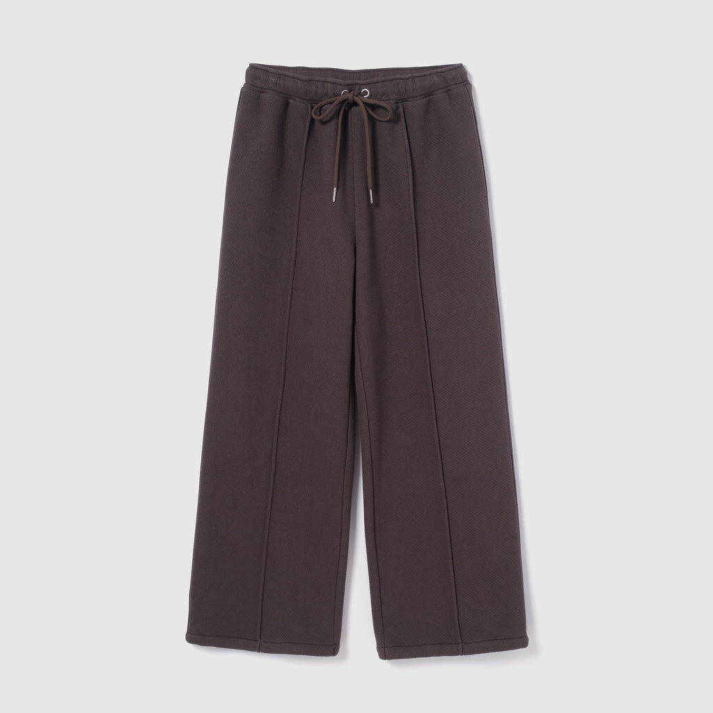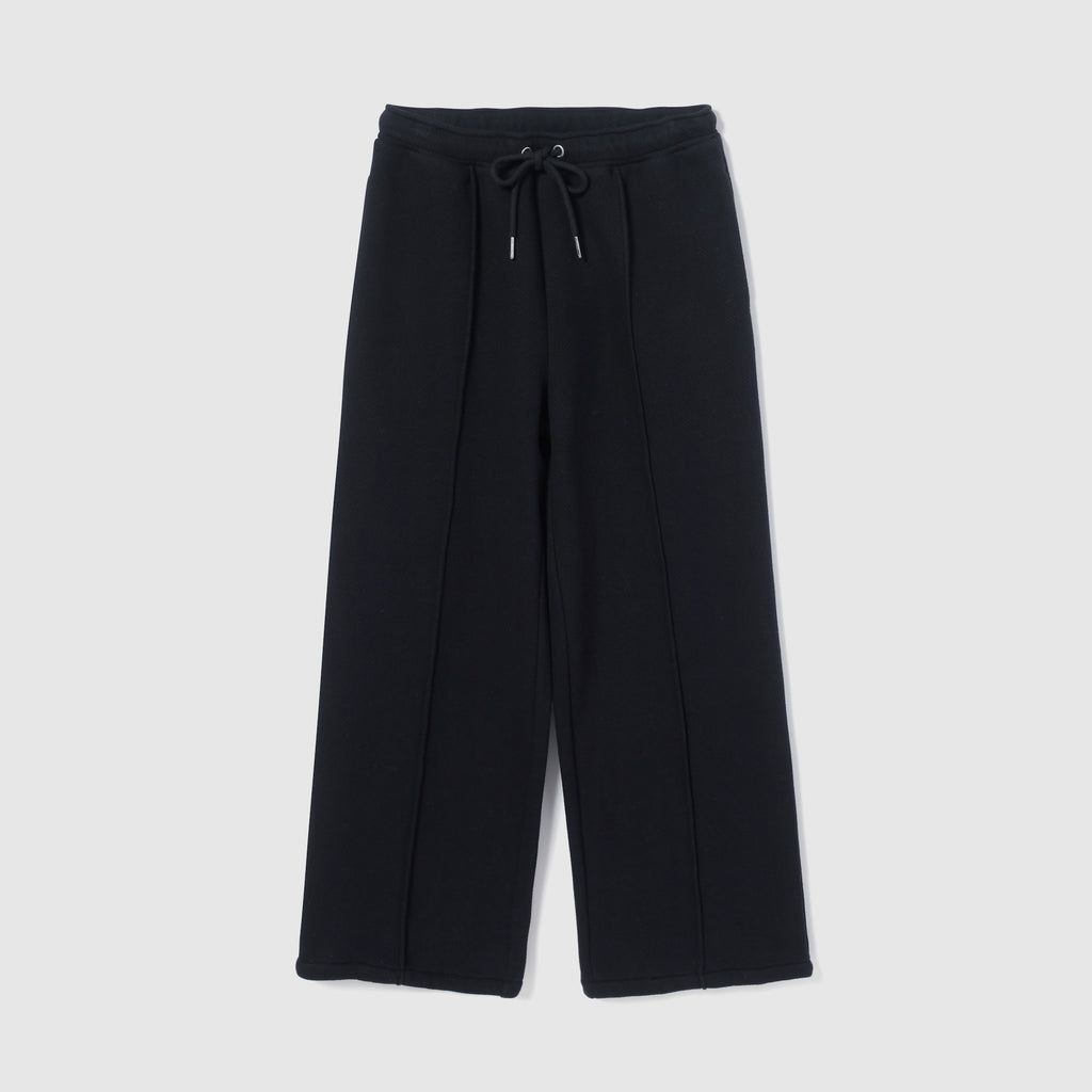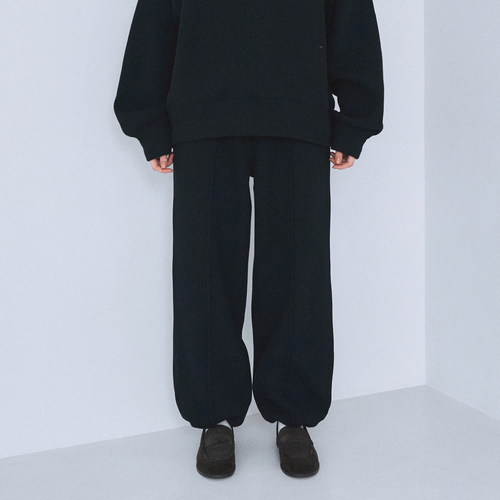 フロントにはピンタックを入れることで、スウェットパンツながらも縦ラインを強調し、スッキリとした印象に。ウエストは1周ゴム仕様でリラックスした穿き心地。紐付きなので細かいサイズ調整も可能です。
