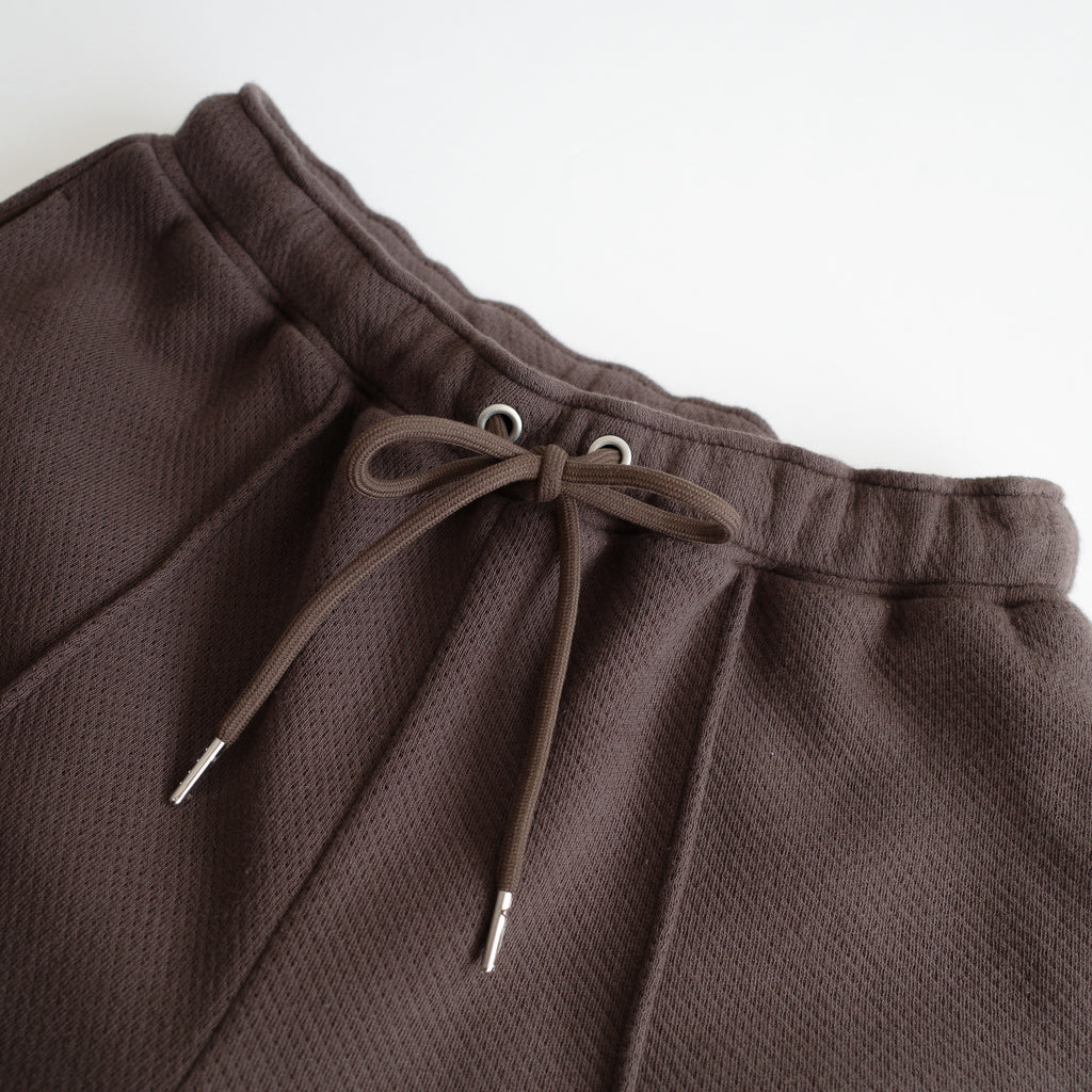メッシュ編みのスウェット素材を用いた大人のためのイージーパンツ。2WAYシルエットと、縦のラインを意識したピンタックで、リラックスしながらも端正な印象を与えます。