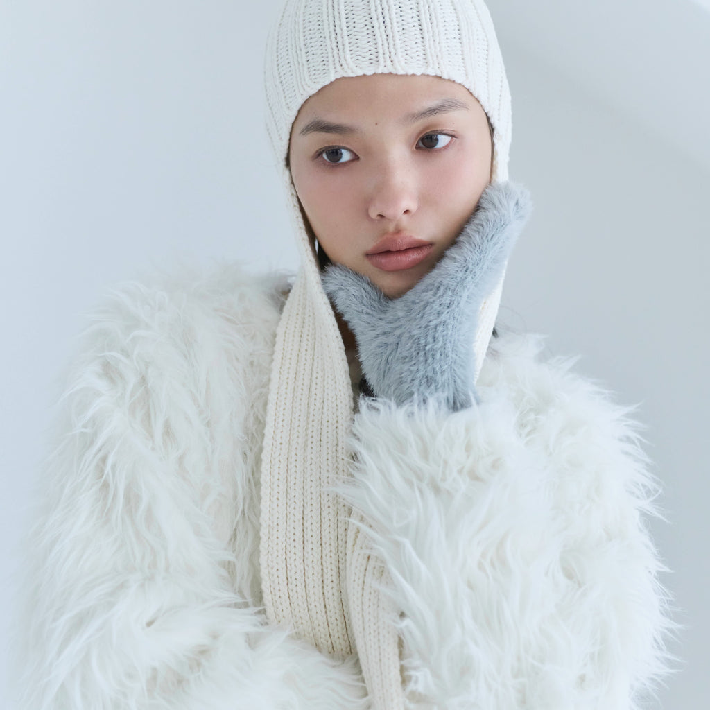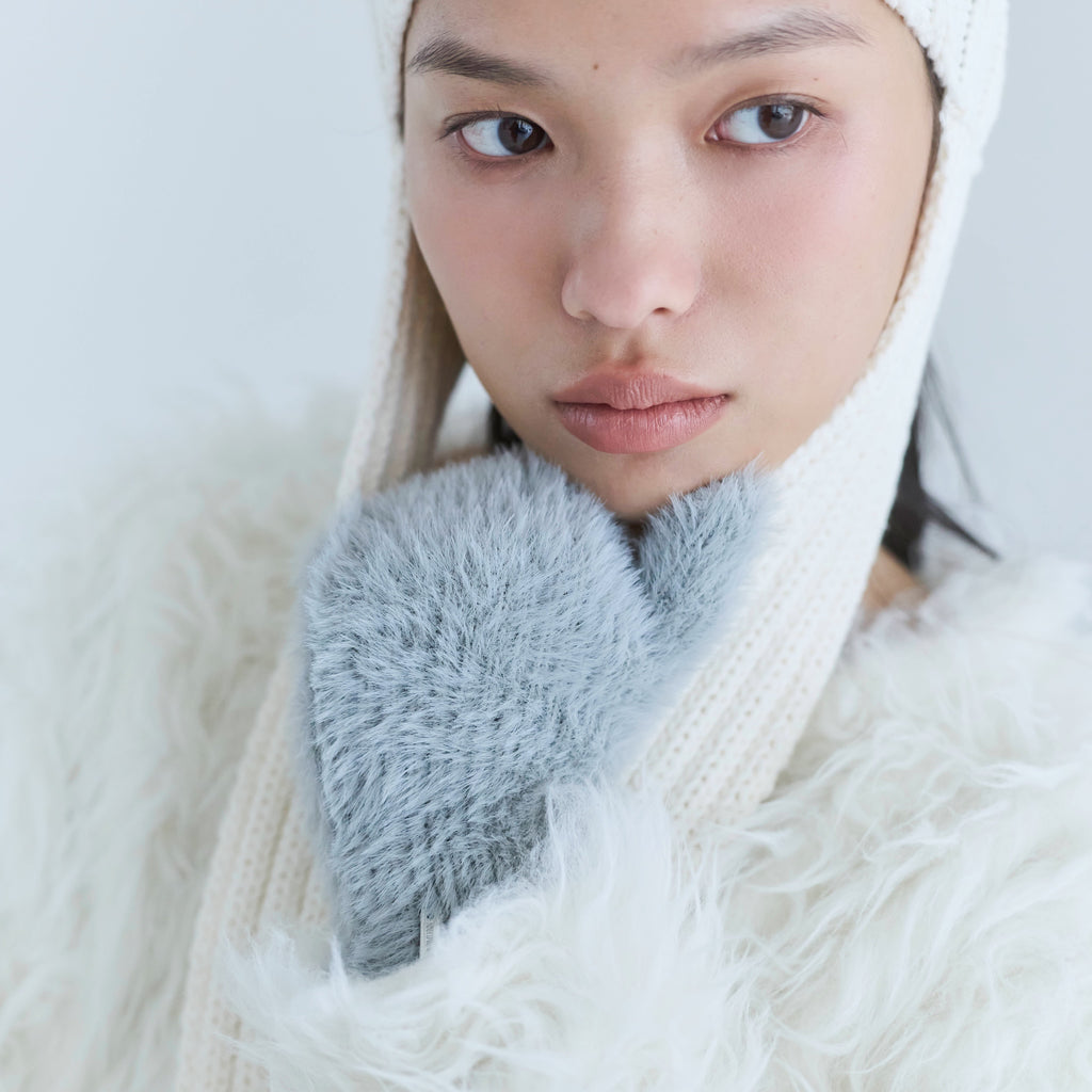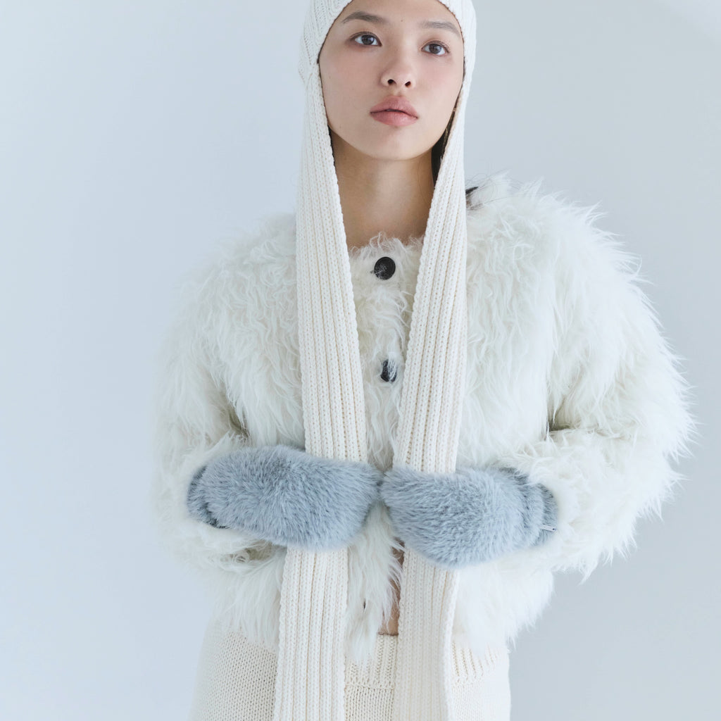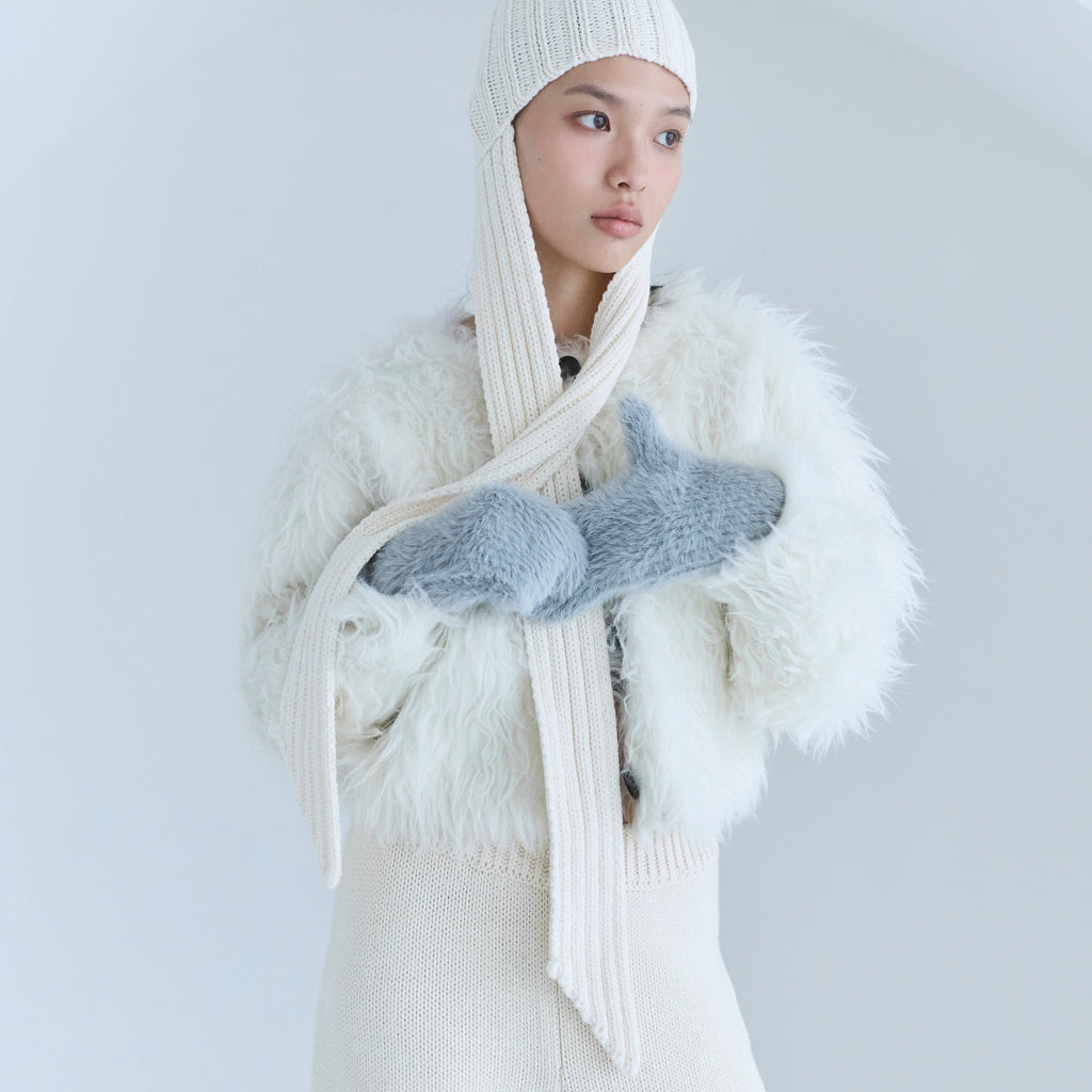毛足の長いシャギーヤーンを用いたミトンは、軽さと保温性を両立。指先まで覆う完全ミトン設計で真冬の防寒に頼れる一品です。上品なメタルネームとふんわりボリュームのあるフォルムが、冬スタイルを華やかに仕上げます。
