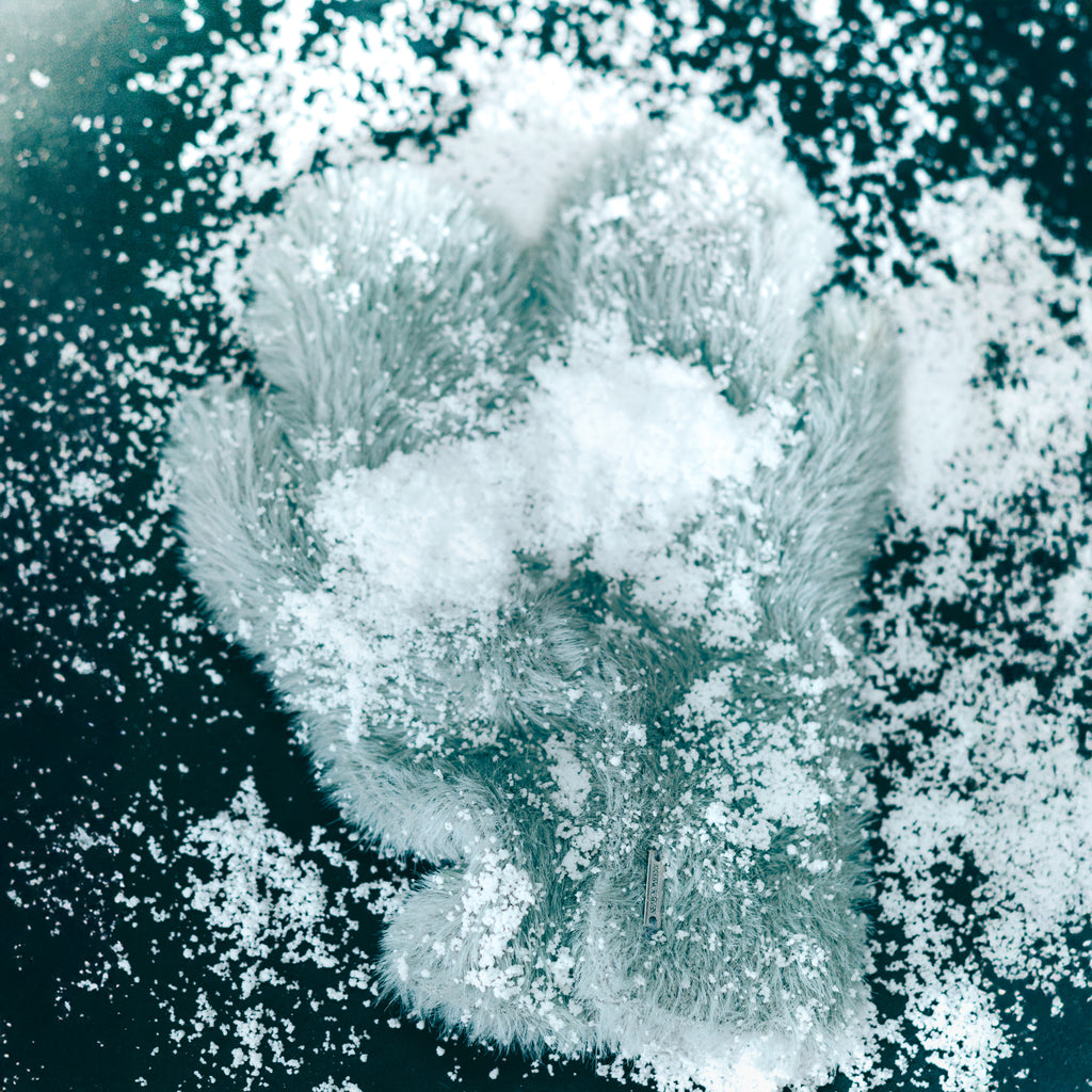 ふわふわと柔らかなシャギーヤーンを使用。毛足の長い糸を編み立て、軽さと暖かさを両立した冬に最適な素材です。肌あたりが優しく、手元を包み込むような心地良さが魅力。